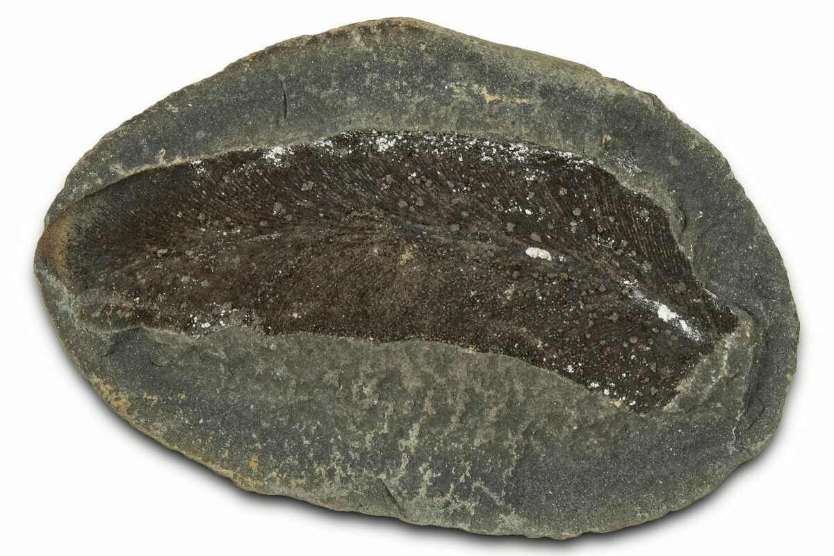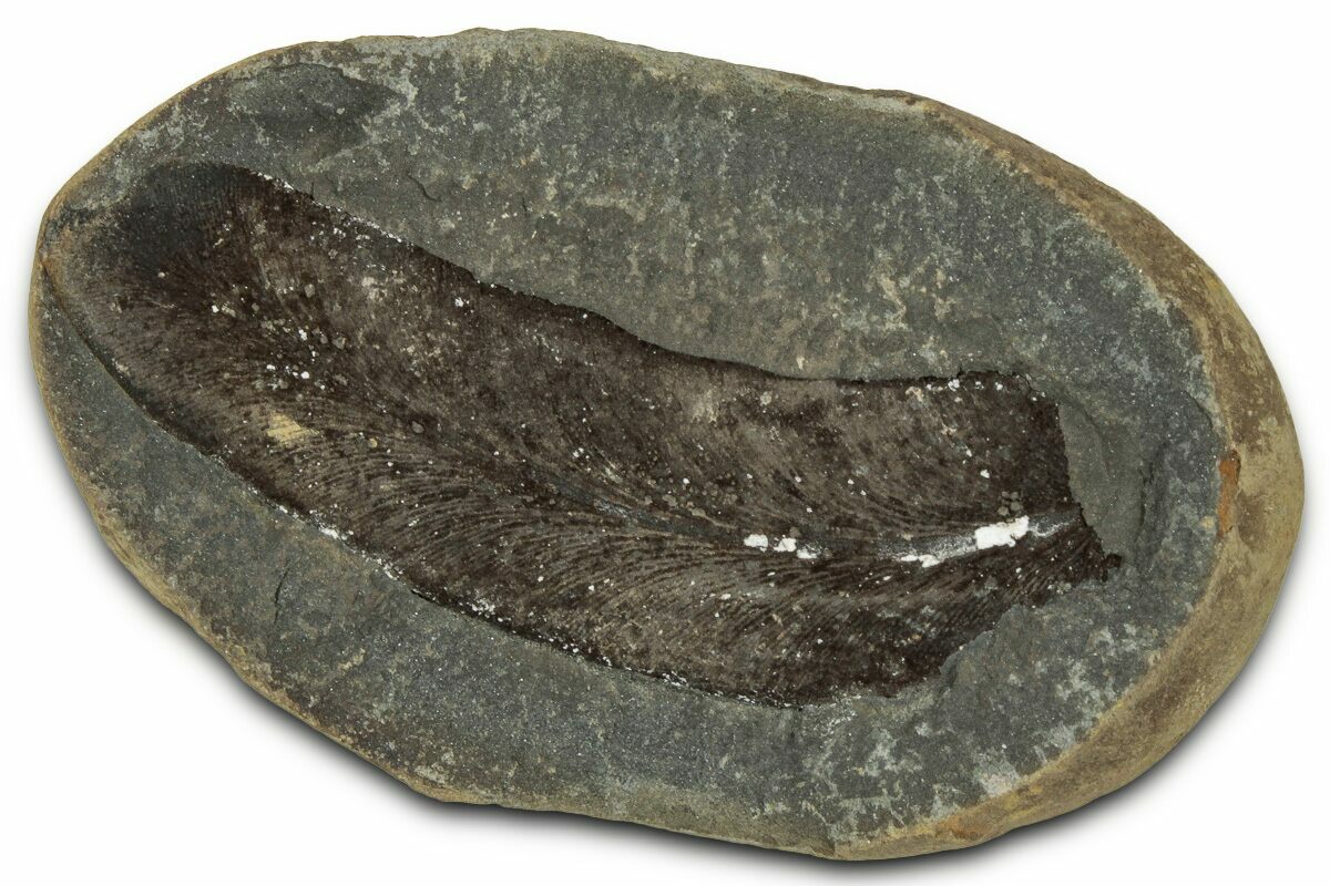 This is a nicely defined fossil leaf of the fern Macroneuropteris preserved inside an ironstone nodule that has been split open. It comes from the famous Mazon Creek Lagerstätte. These ironstone nodules have been collected for decades from the spoil heaps of abandoned coil mines near Coal City, Illinois.
