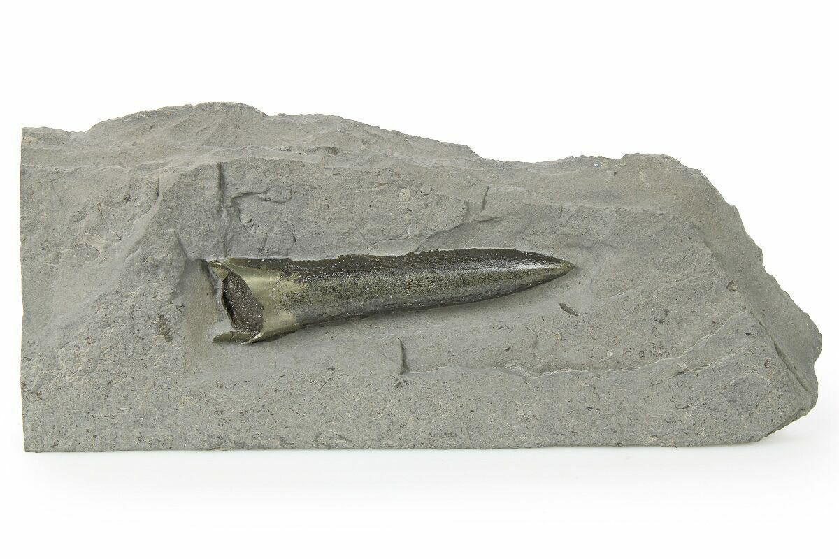 This is a 2.2" long, partially pyritized fossil belemnite (Acrocoelites sp.) from the Jurassic-aged Posidonia Shale of Holzmaden, Germany. The belemnite has been exposed from the rock it was found in.