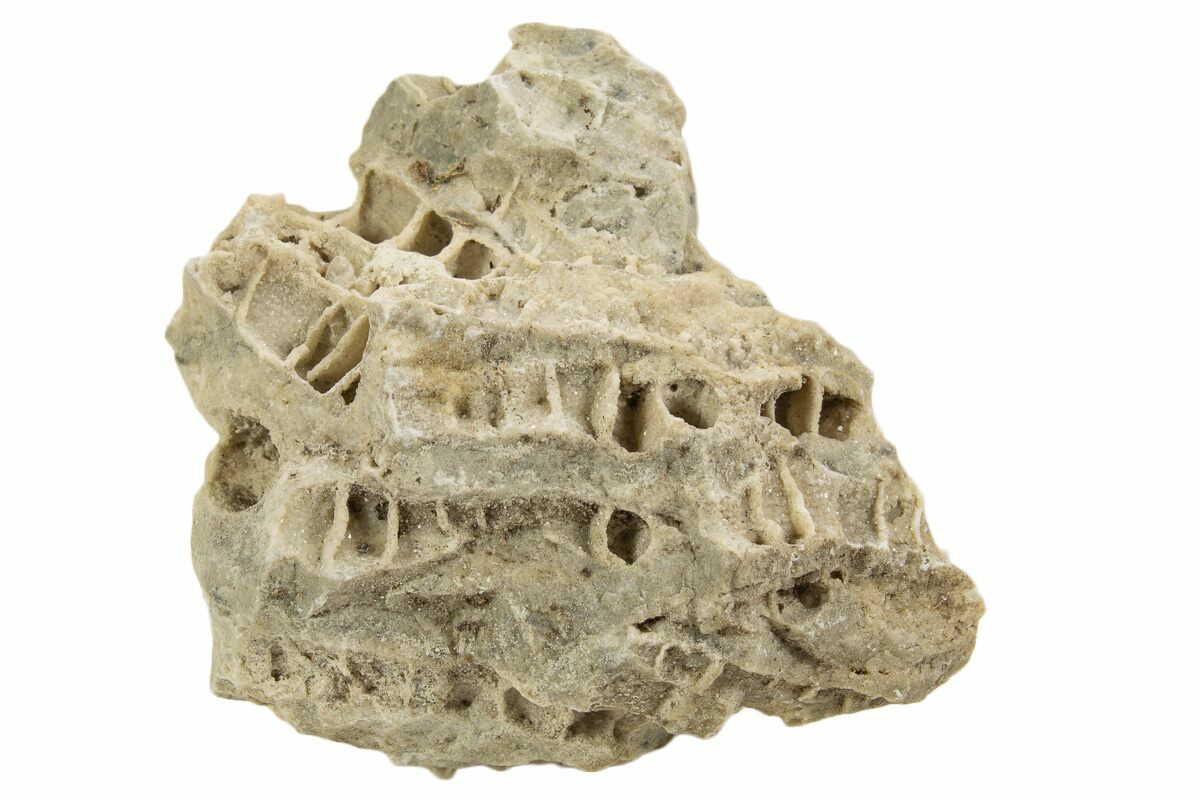 This is an interesting 2.2" wide section of dolostone containing fossil rugose coral of the species Fletcheria guelphensis. It has been left in its rough state to reveal the sparkling interior of the coral's "skeleton". The dolostone was collected from a Middle Silurian-aged deposit within the Greenfield Formation in Clay Center, Ohio.