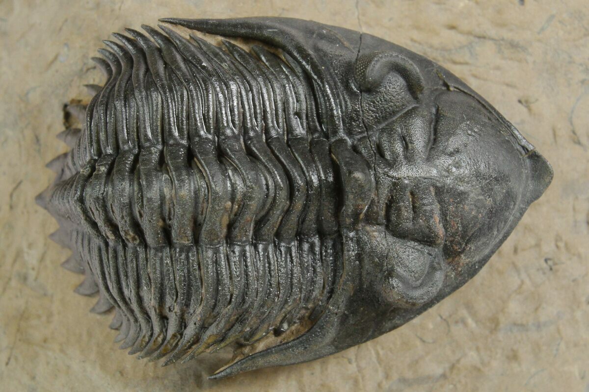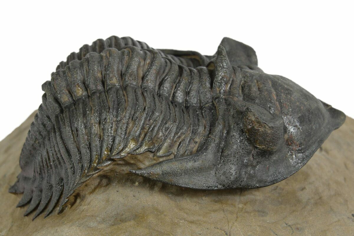 This is a beautiful, 2.2" long specimen of Metacanthina issoumourensis collected near Lghaft, Morocco. It has a beautiful, chocolate brown shell preservation and the preparation is excellent. The rock surrounding the trilobite has been undercut during preparation, bringing it out in high relief. Much of the shell surface on the right side of its head has been restoratin.