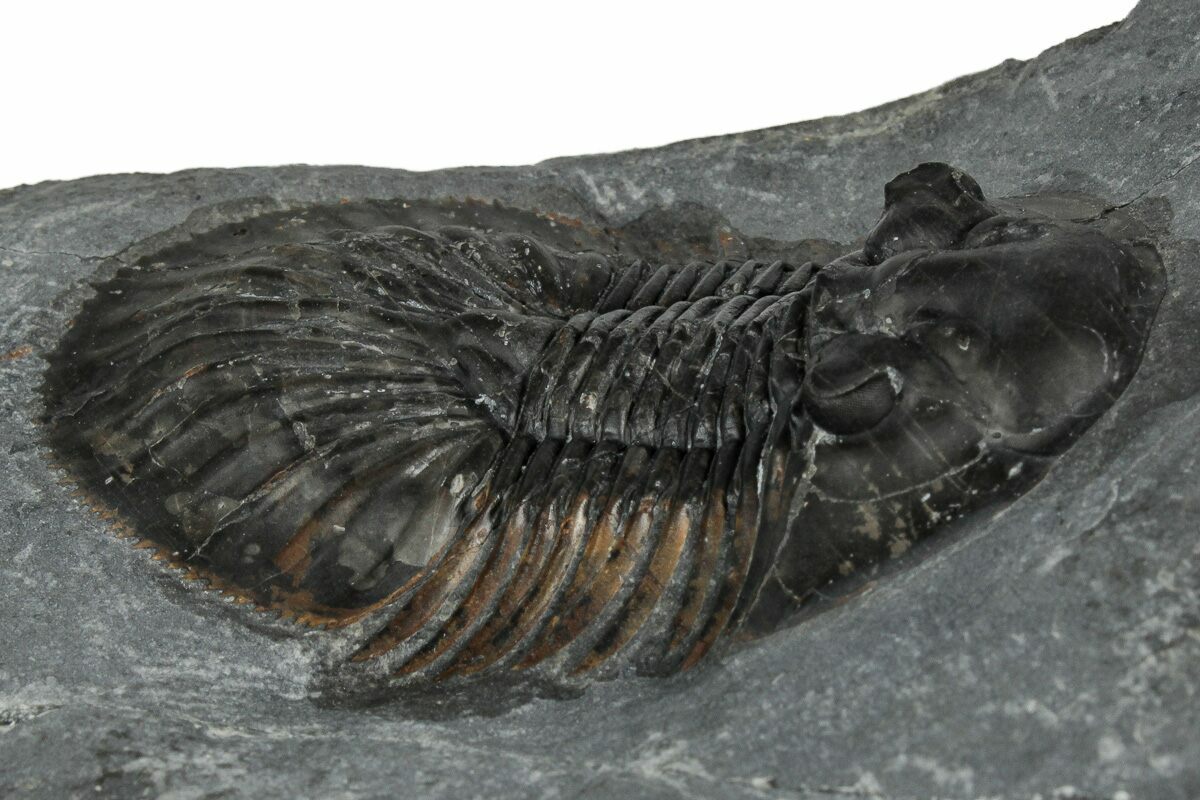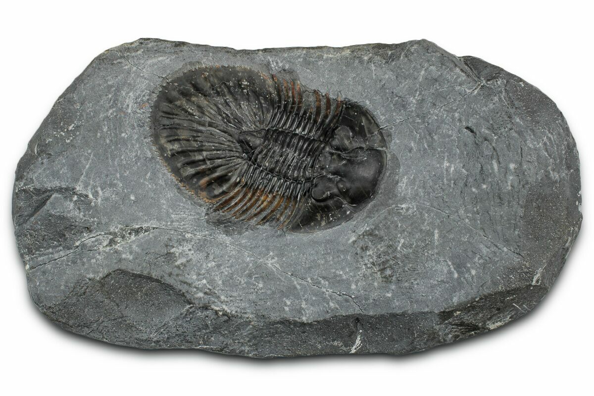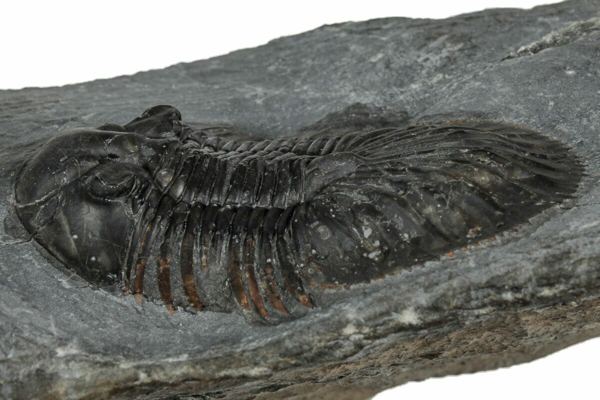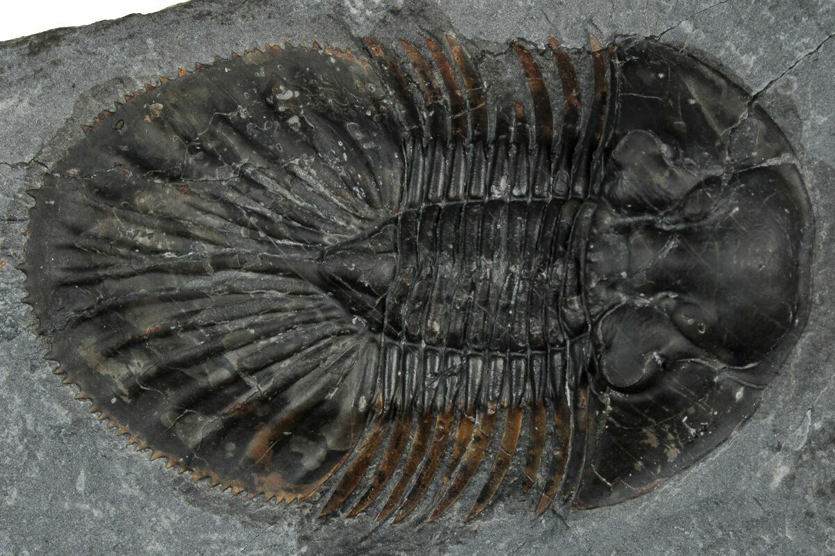 This is an nice, 2.2" long Thysanopeltis trilobite from the El Otfal Formation of Morocco. This species has a distinctive fringe of pygidial (tail) spines. It has about 2-3% shell restoration in total on the left side of its tail.