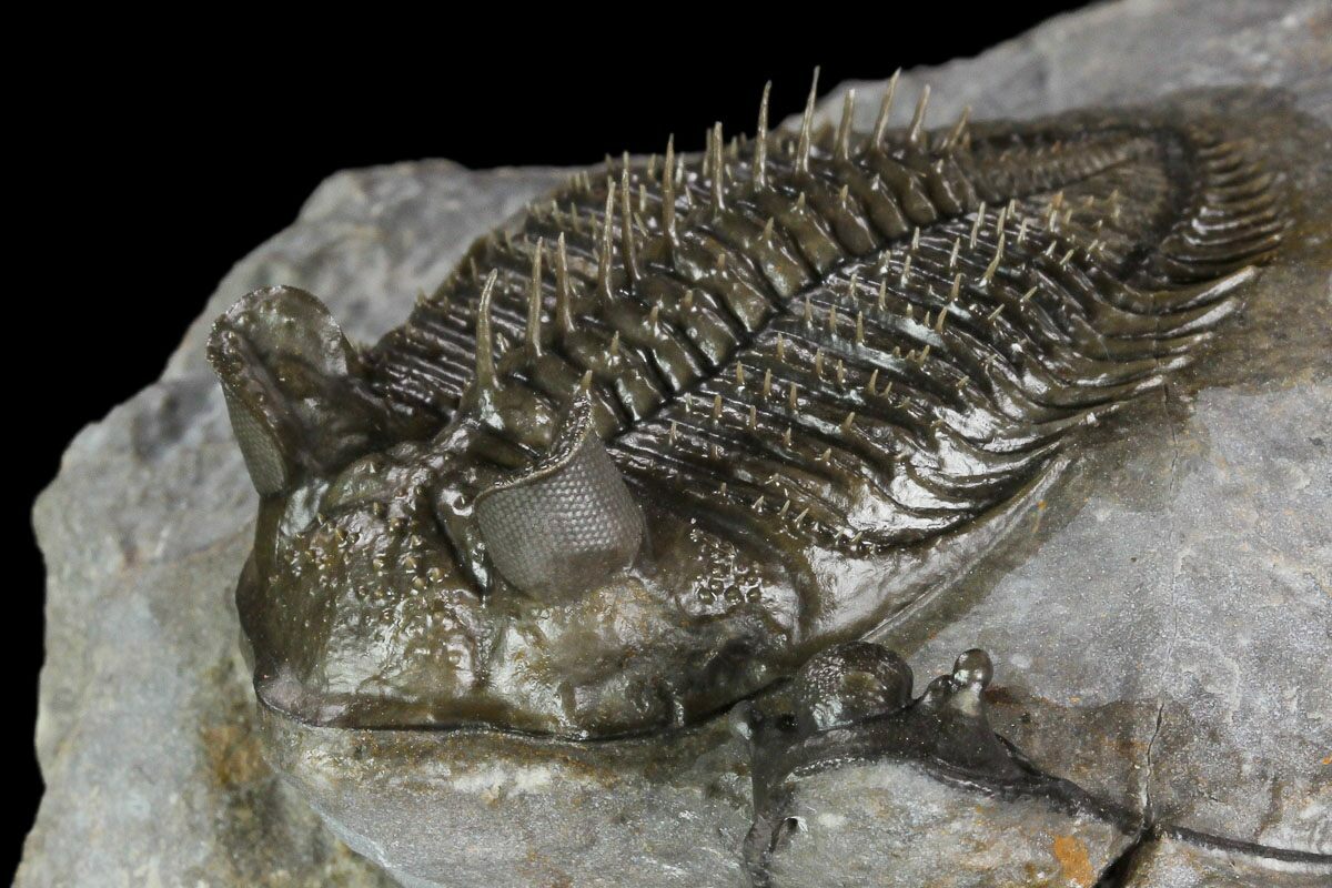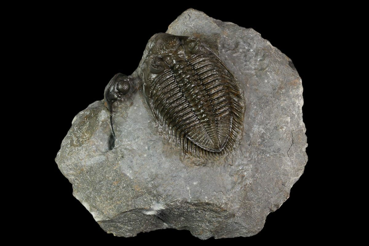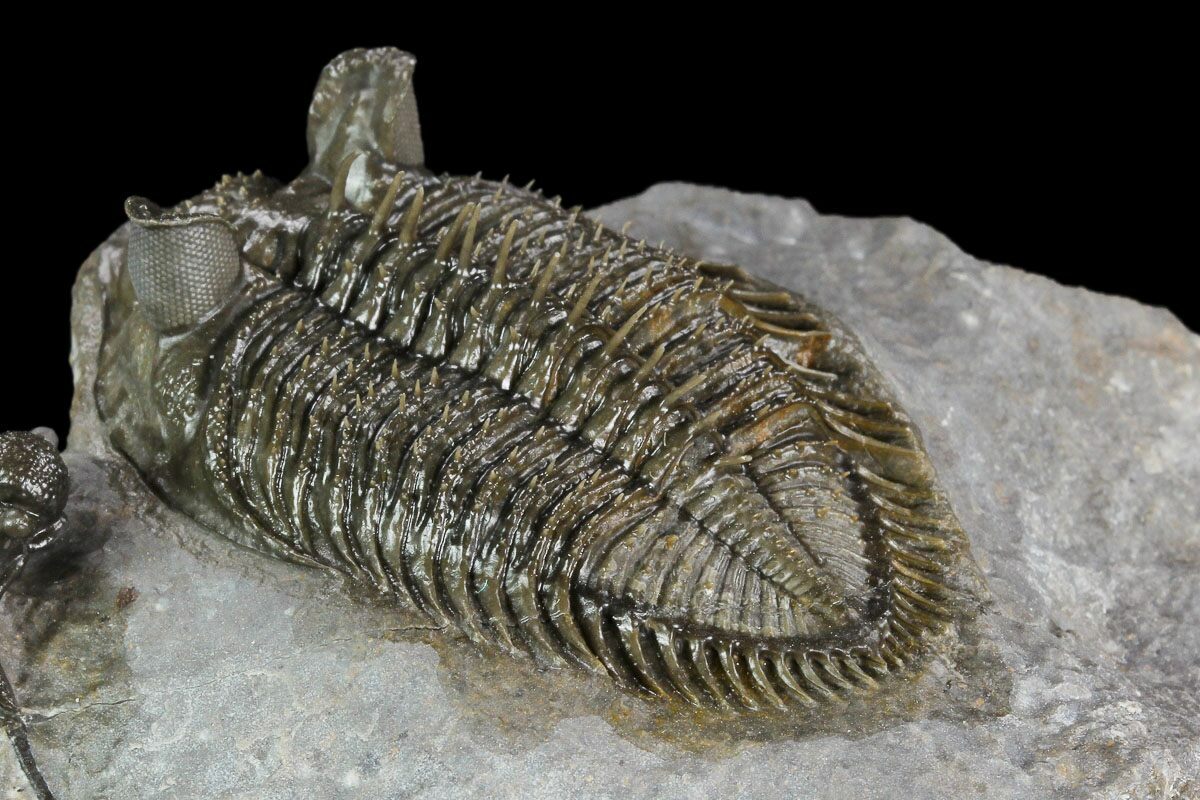 This is a top quality, 2.2" long, tower-eyed, Erbenochile trilobite from a very unusual location. Nearly all of the Erbenochile come from near Foum Zguid but this one was quarried near Jbel Ou Driss, Morocco. The rock is much harder at this location, and more time consuming to prepare.