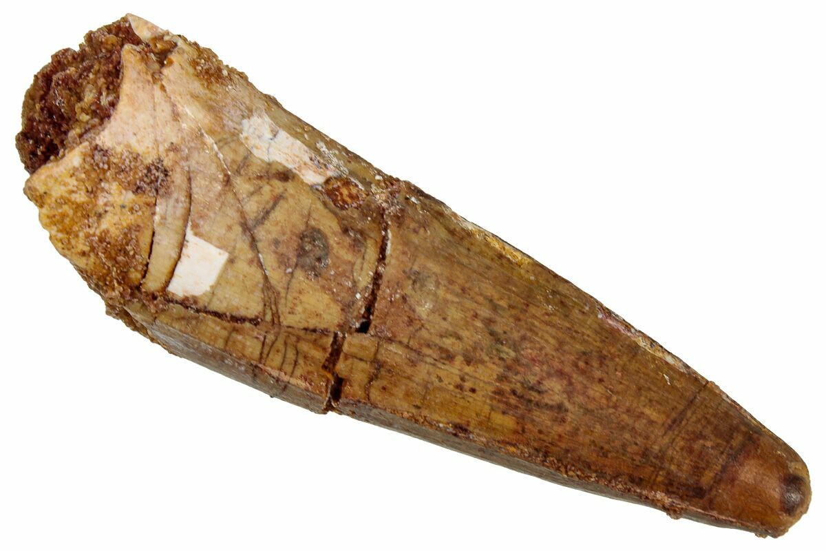 Spinosaurus teeth are relatively common fossils, but large (3+ inches), well-preserved examples are rare. These large Spinosaurus teeth will often be heavily doctored. We’ve seen many examples where multiple partial teeth can been glued to together to create a larger fake tooth, or where enamel has been painted on. One giveaway to look for is a ring of sand around the middle of the tooth, usually glued on to hide a break. Sometimes this is a sign that multiple partial teeth have been composited, but other times it is used to disguise a badly done repair job.
