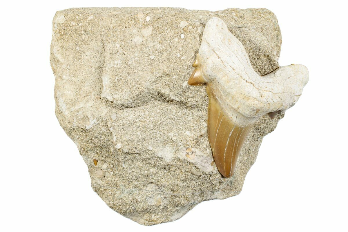 This is a 2.23" fossil tooth of the extinct giant mackerel shark, Otodus obliquus, from the phosphate deposits in the Oulad Abdoun Basin of Morocco. It is Eocene in age, or approximately 54 million years old. The tooth is only partially exposed from the rock in which it was found.