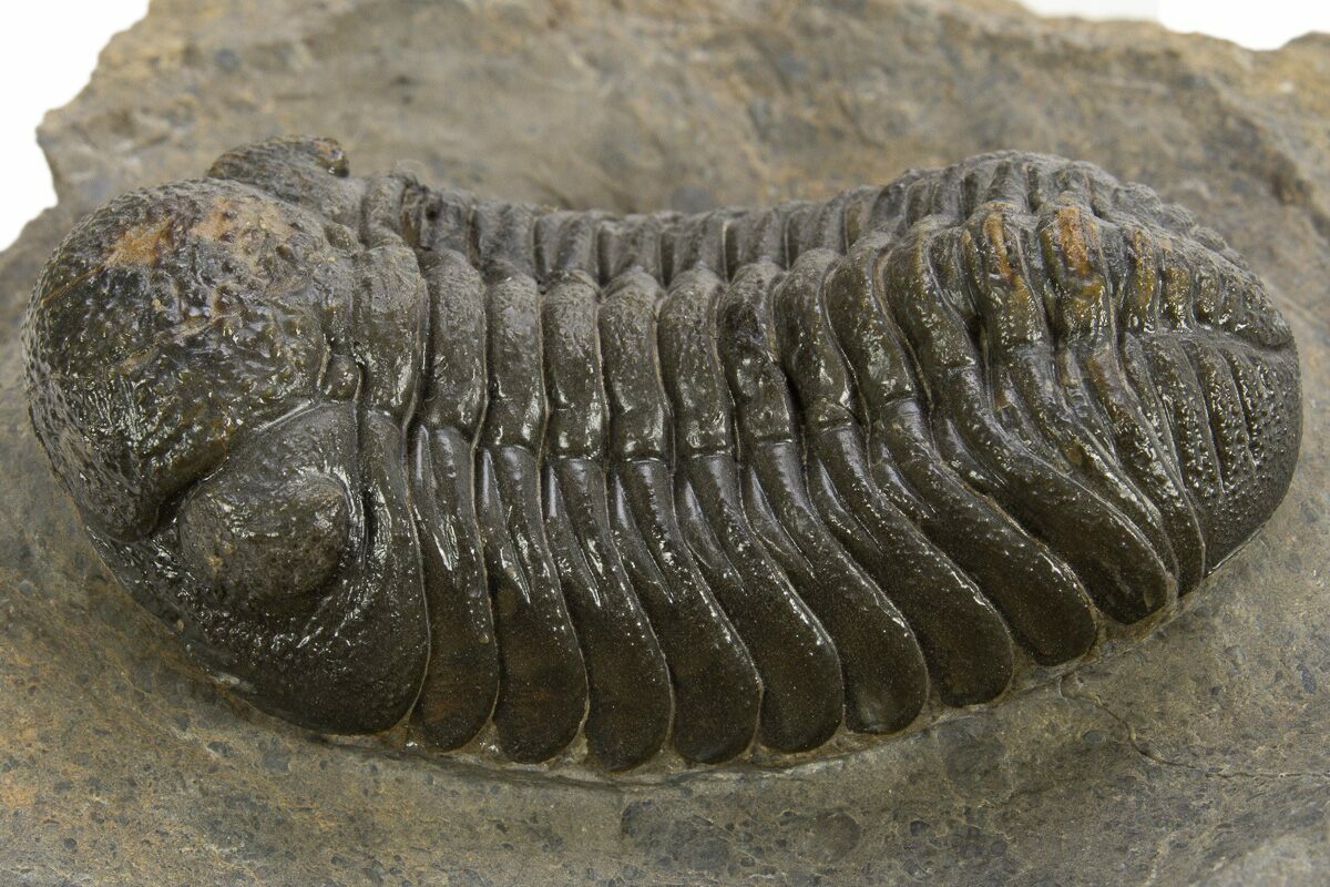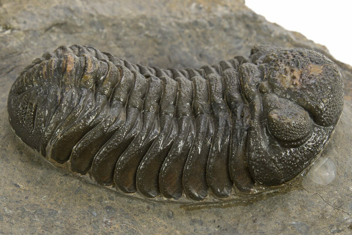 This is a detailed, 2.25" long Morocops trilobite from Morocco. There is good eye facet preservation in both eyes. It has about 1% shell restoration in total.