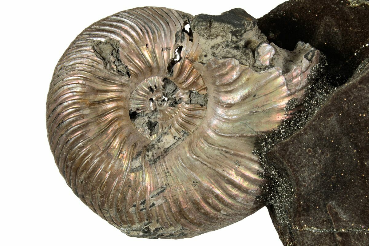 This is an interesting and colorful pyritized ammonite (Quenstedticeras sp.) display. The ammonite was collected from the Middle Jurassic age deposits along the banks of the Volga River near Saratov, Russia. It has been mounted to this section of iridescent pyrite ("rainbow pyrite") encrusted rock to create this alluring display.