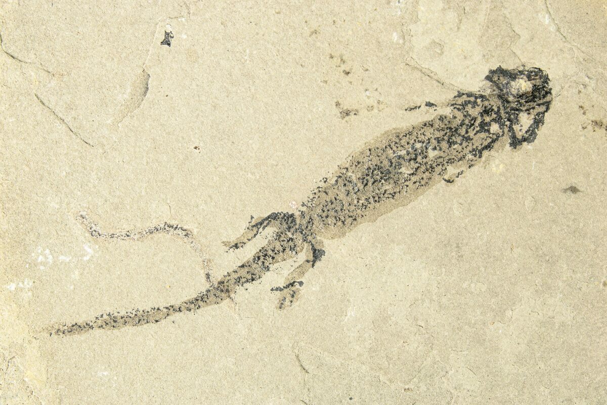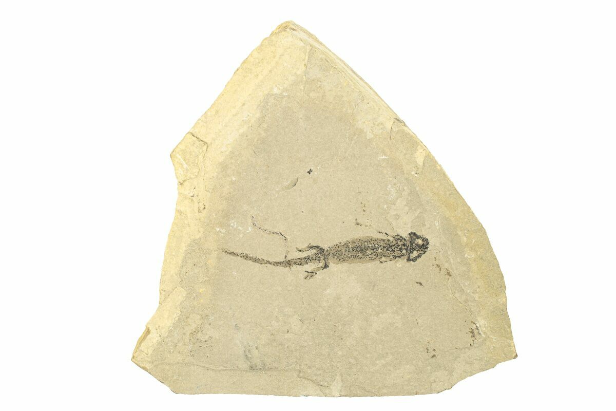 This is a 2.25" fossil of Sclerocephalus, a primitive amphibian during the Permian period, some 280 million years ago. It has remarkable soft-bodied preservation. A coat of sealant has been applied over the top of it, as it's preserved in a delicate, carbon film.