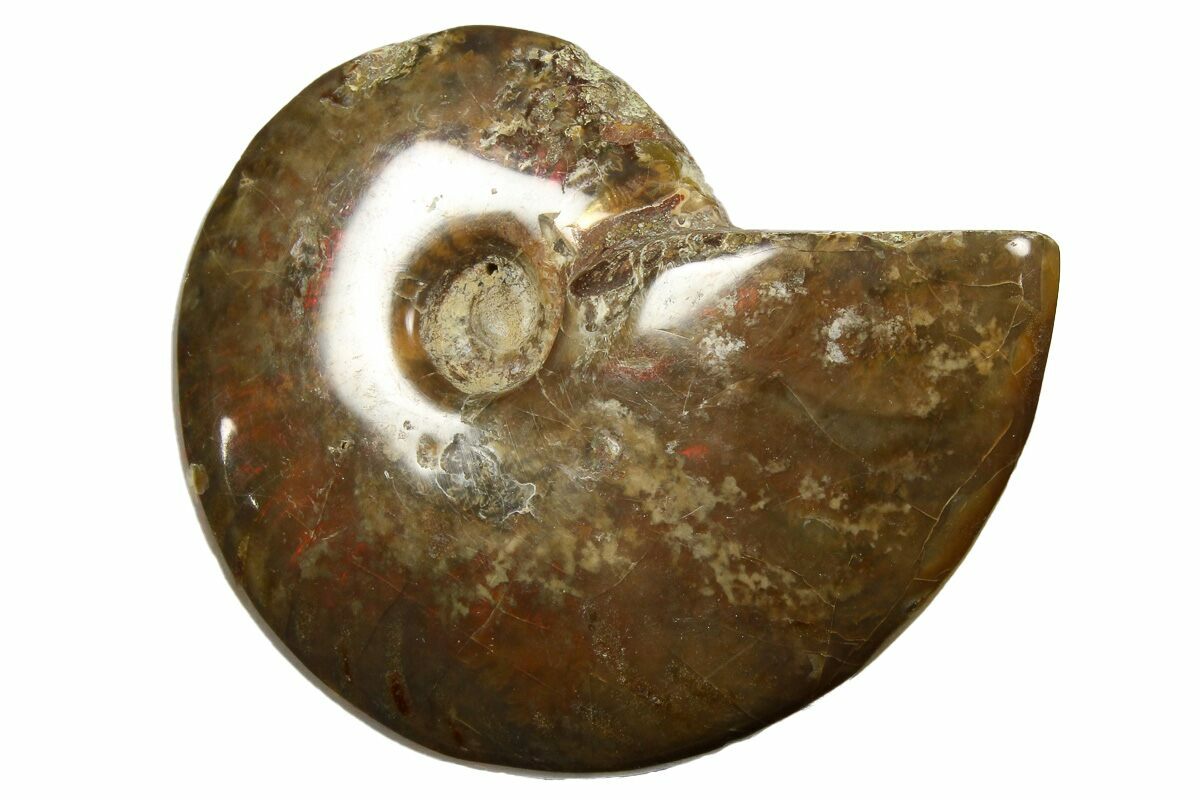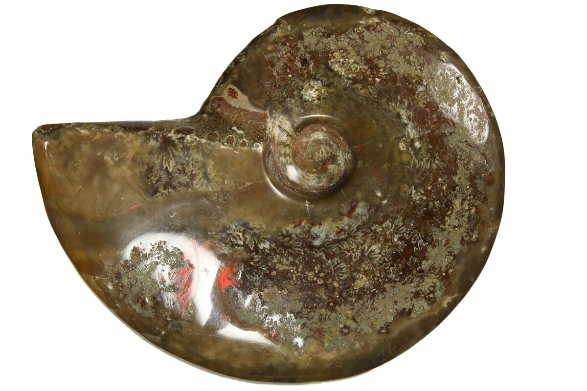 Photos don't do justice to this 110 million year old, polished ammonite fossil. It shines with brilliant iridescent red hues when the light hits it from certain angles.