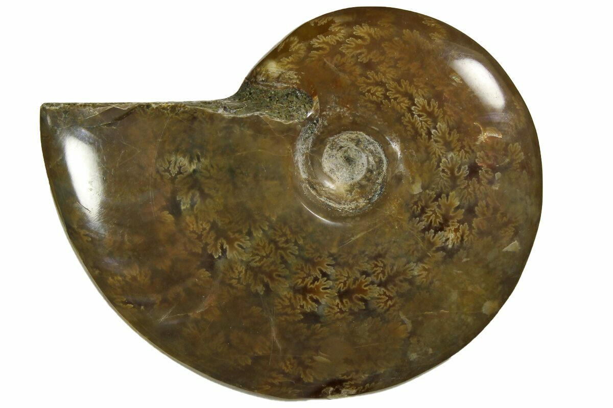 Photos don't do justice to this 110 million year old, polished ammonite fossil. It shines with brilliant iridescent red hues when the light hits it from certain angles.