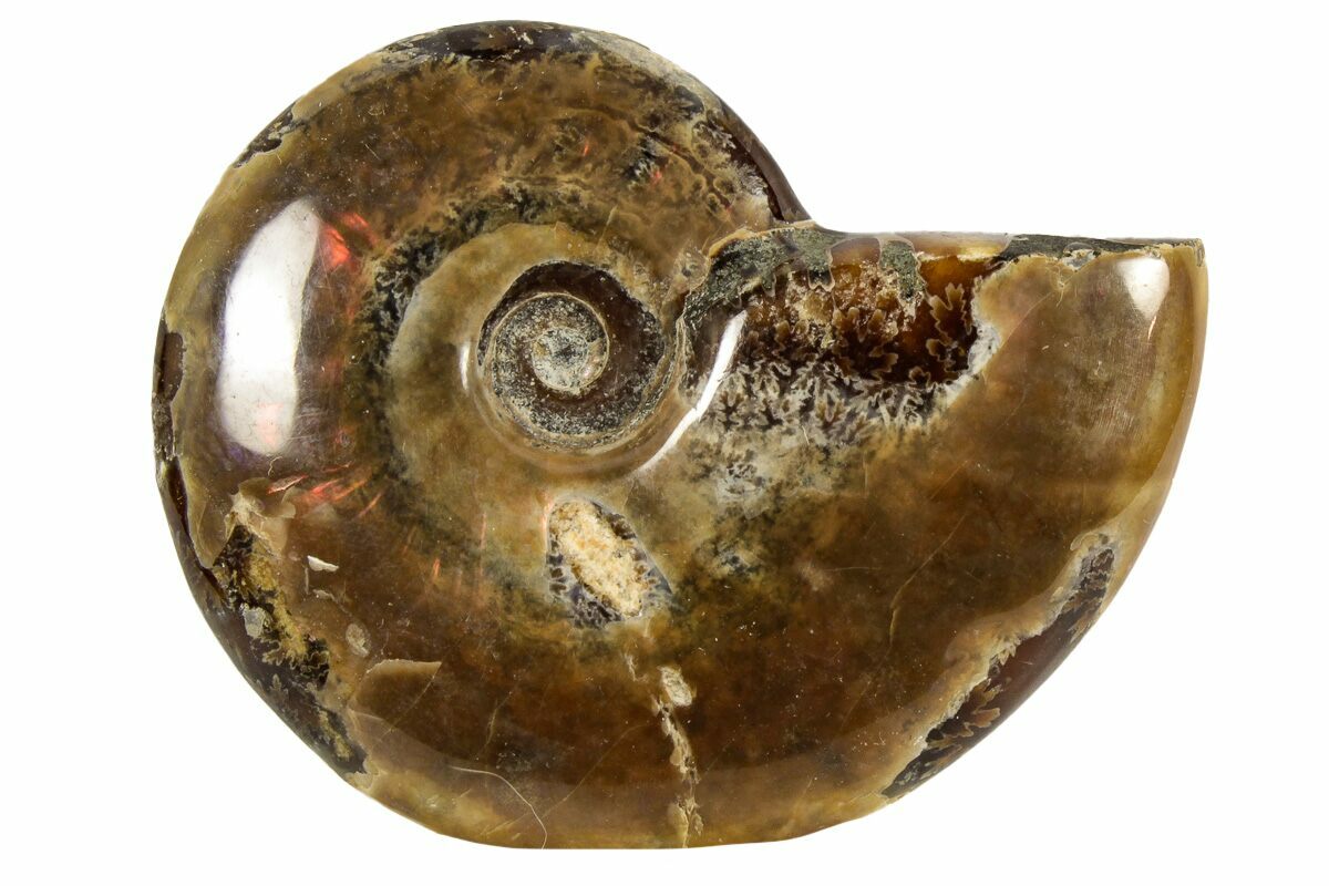 Photos don't do justice to this 110 million year old, polished ammonite fossil. It shines with brilliant iridescent red hues when the light hits it from certain angles.