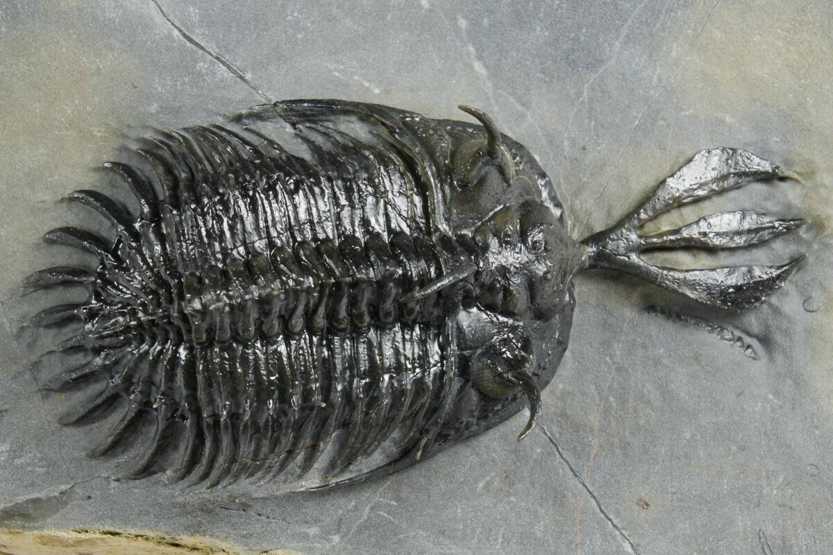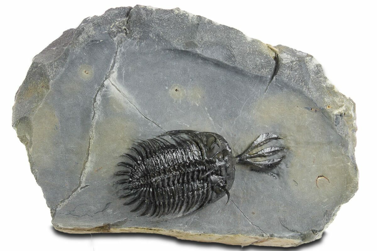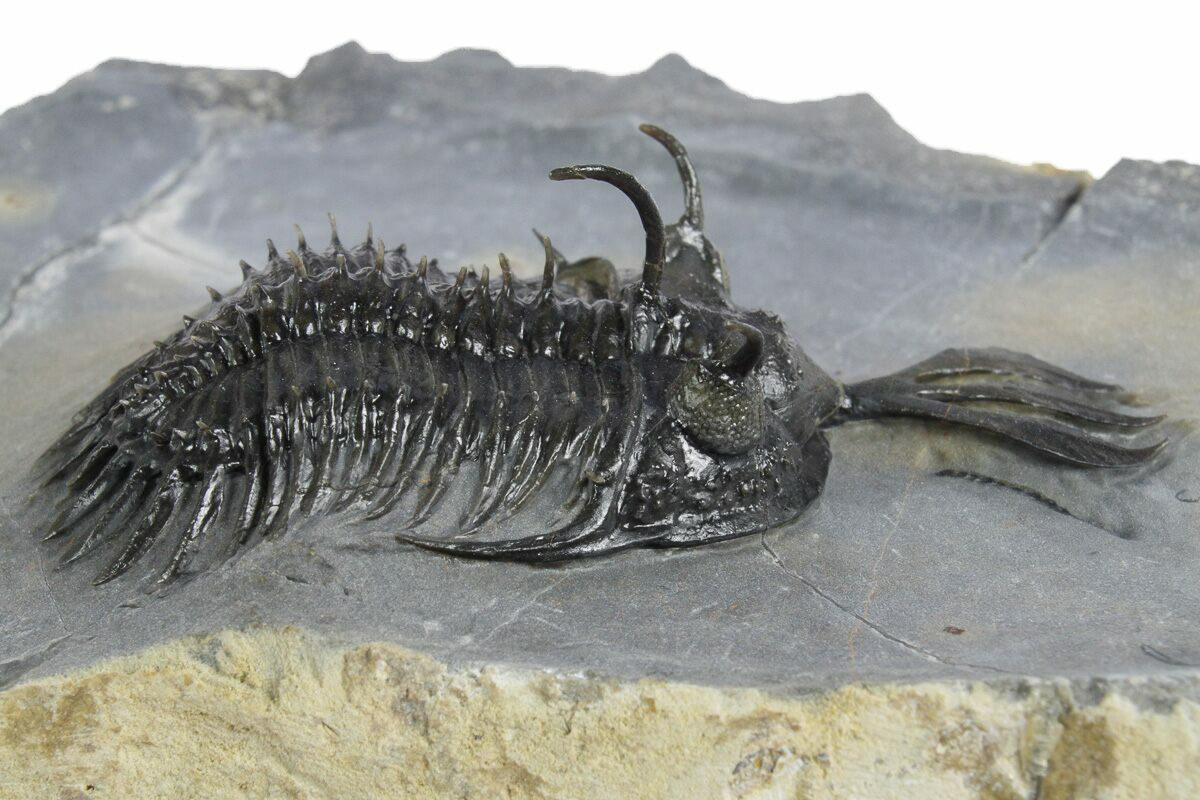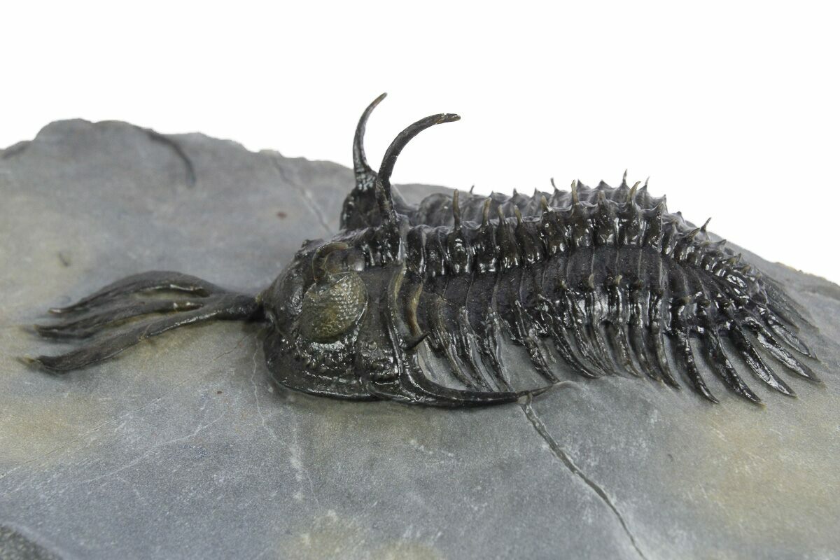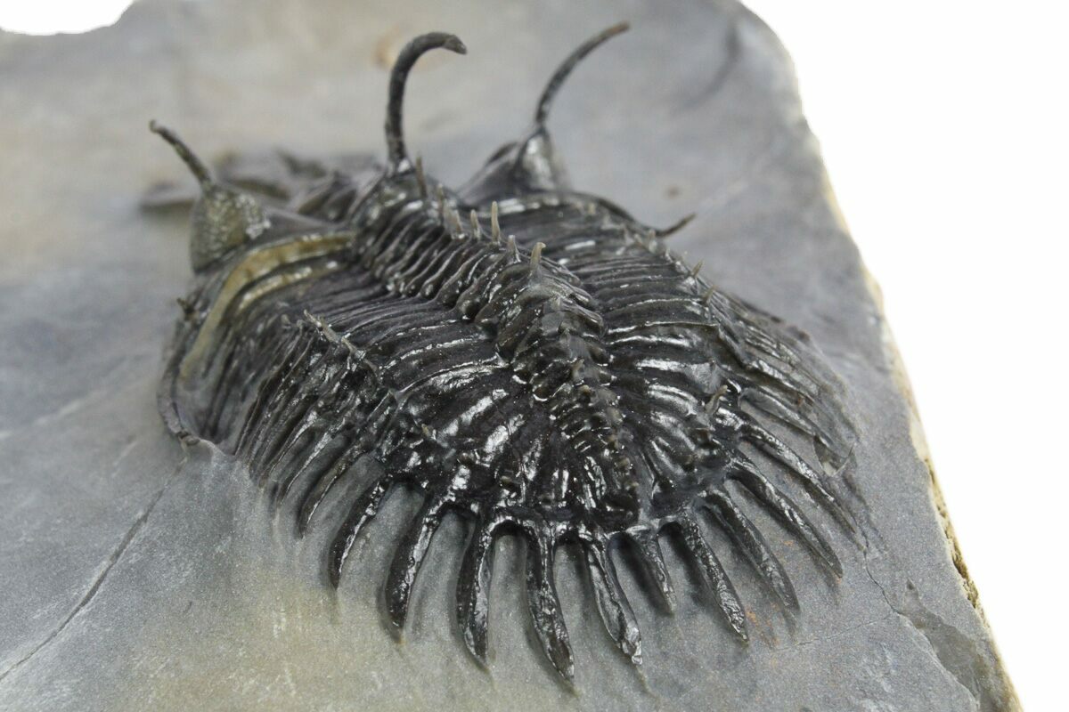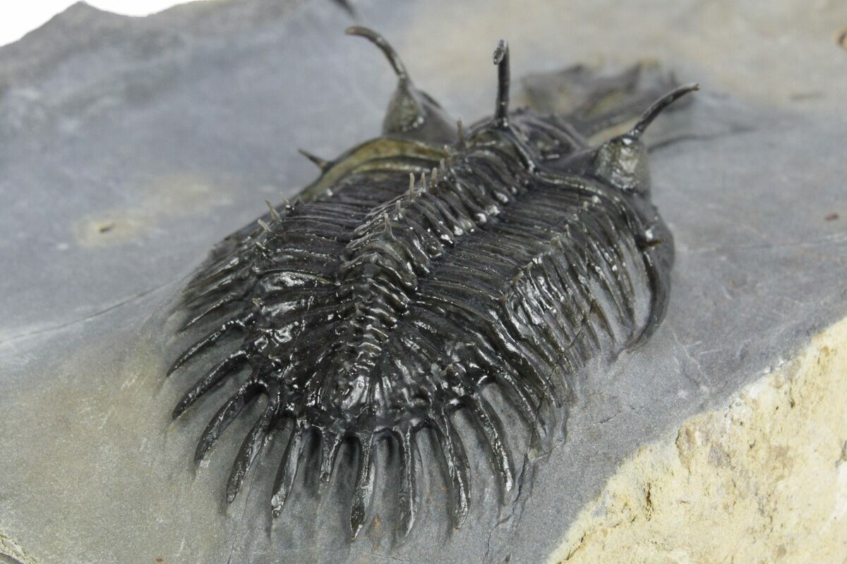 This is a 2.25" long, spiny, Walliserops trilobite fossil from Timrzit, Morocco. It has over 40, small free-standing spines, and is well prepared with no restoration.