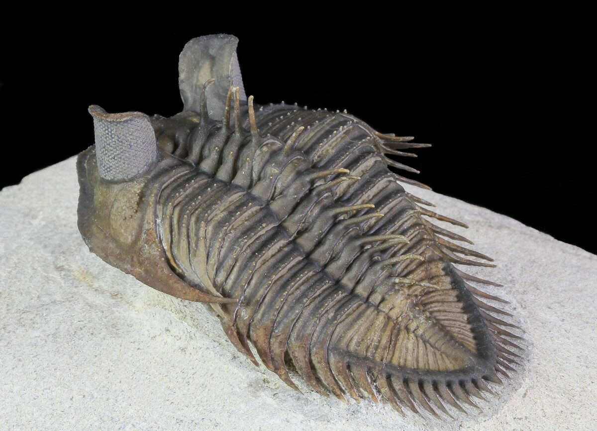 This an absolutely stunning specimen, rare, tower-eye, Erbenochile erbeni trilobite from Foum Zguid, Morocco. It's good-sized and nicely outstretched at 2.25" long. Excellent preparation with dozens of free-standing spines and clear eye facets. A top quality specimen with no restoration.