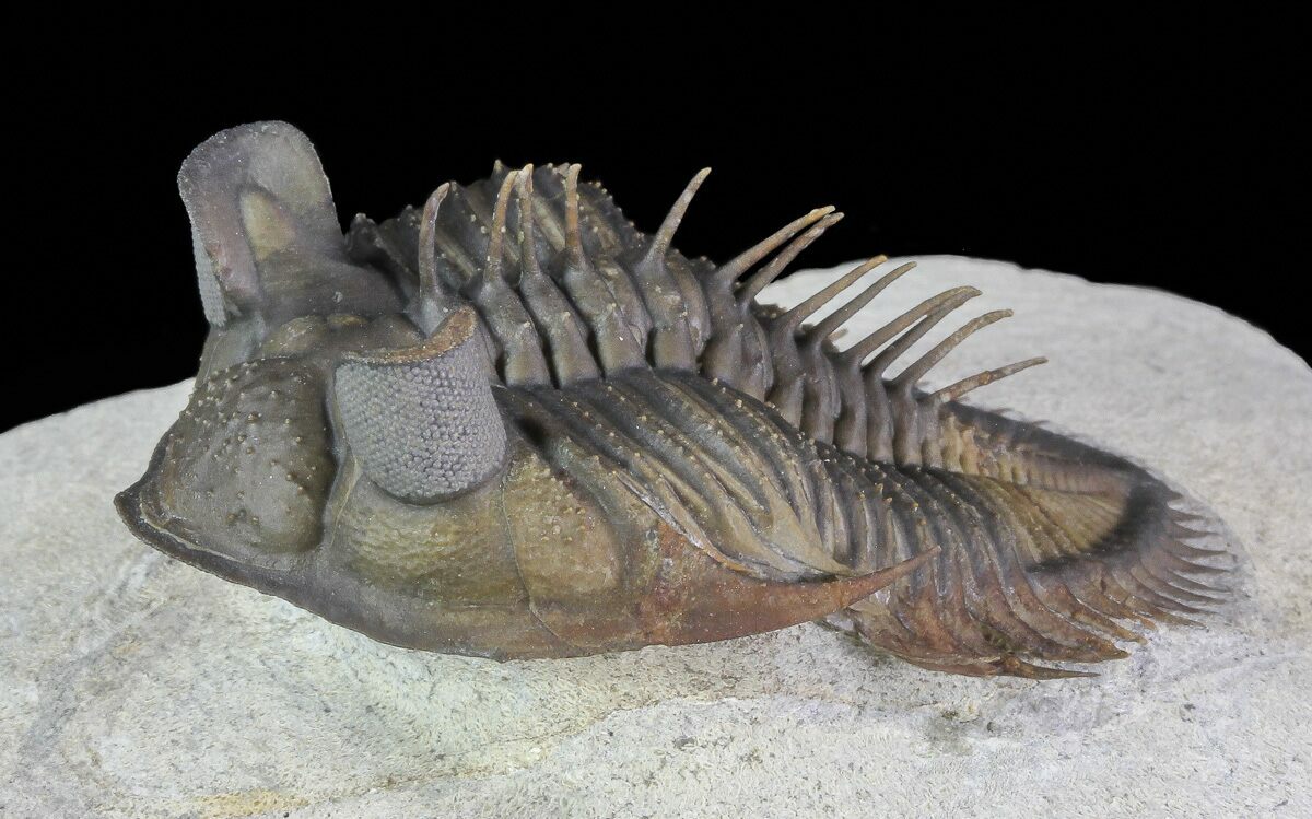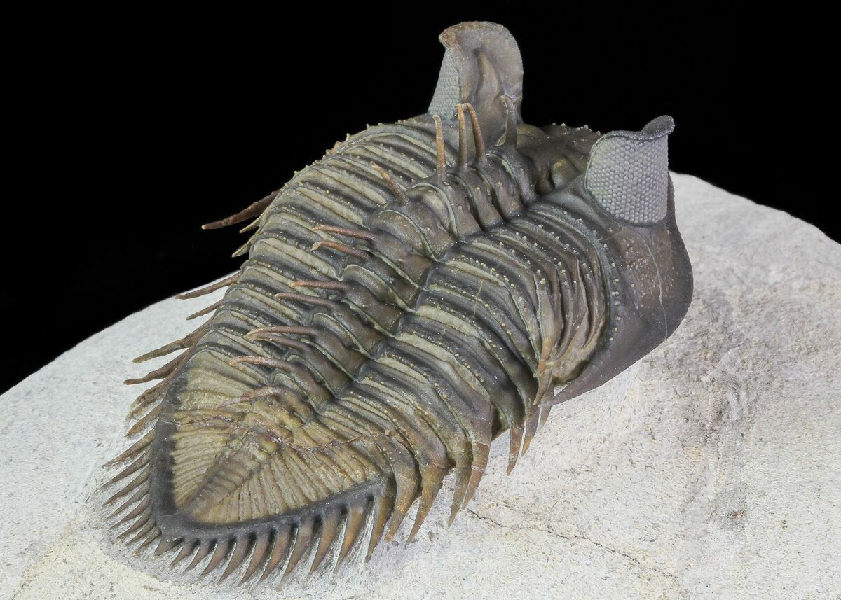 This species has extraordinarily large eyes containing over 400 eye facets. The massive eyes allow full 360 degree coverage in the horizontal plane and were high enough to allow the trilobite to see backwards over its thorax.