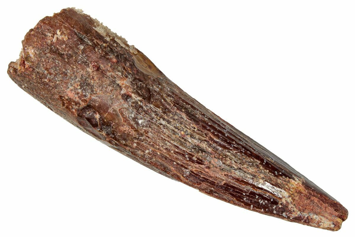 This is a 2.26" long Spinosaurus tooth from the Kem Kem Beds of Morocco. It is Late Cretaceous in age, approximately 95 million years old.