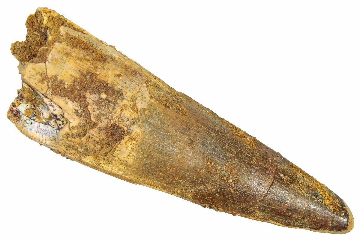 Spinosaurus teeth are relatively common fossils, but large (3+ inches), well-preserved examples are rare. These large Spinosaurus teeth will often be heavily doctored. We’ve seen many examples where multiple partial teeth can been glued to together to create a larger fake tooth, or where enamel has been painted on. One giveaway to look for is a ring of sand around the middle of the tooth, usually glued on to hide a break. Sometimes this is a sign that multiple partial teeth have been composited, but other times it is used to disguise a badly done repair job.