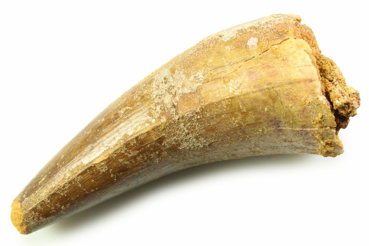 This is a 2.29" fossil crocodylomorph tooth from the Kem Kem Beds of Morocco. There are at least six genera known from the Kem Kem Group with very little described material. This makes it difficult to accurately identify the teeth.