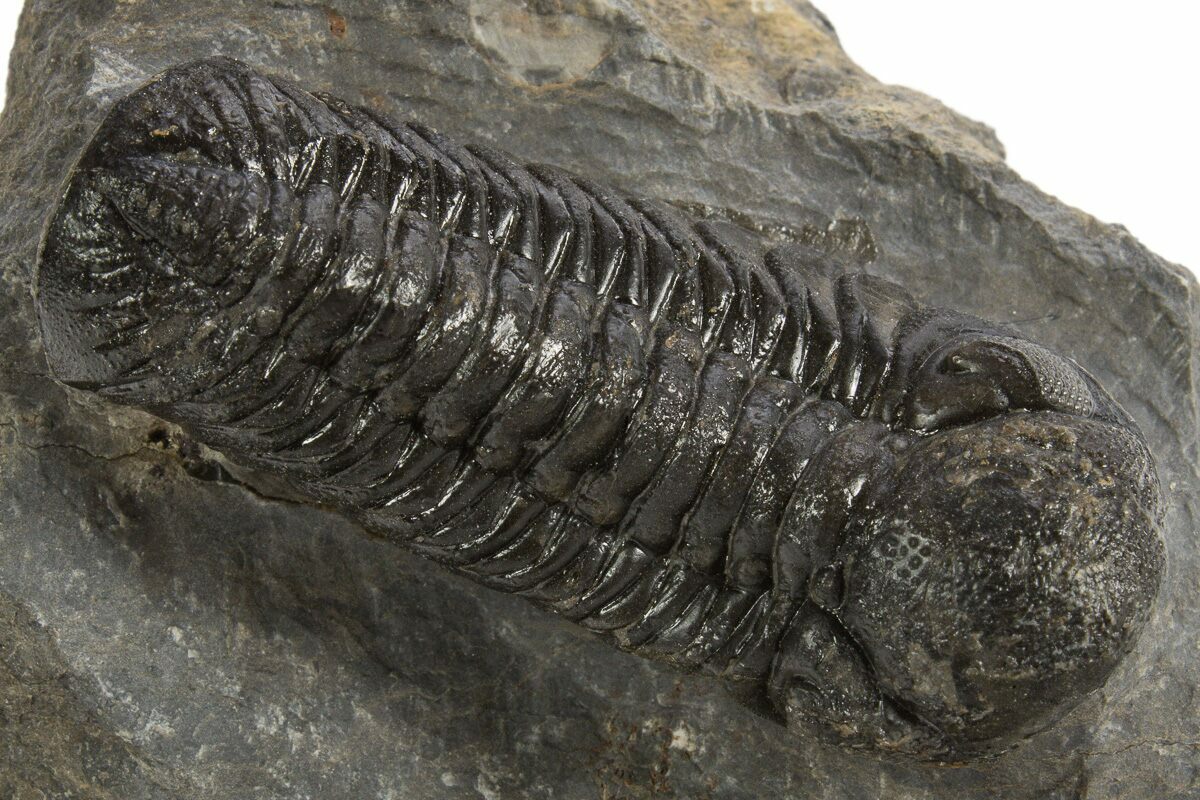This is , 2.3" long Austerops trilobite from Ofaten, Morocco. Good eye facet preservation can be seen in both eyes. It has about 2-3% shell restoration, primarily on the front of its head.