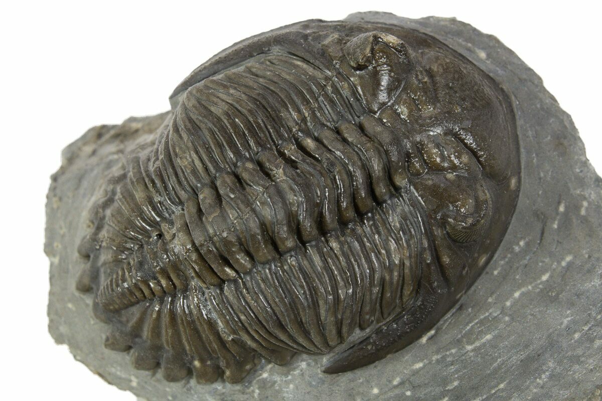 This is a detailed, 2.3" long, Hollardops trilobite from the Ofaten region of Morocco. It features visible eye facet preservation in both compound eyes and only about 3-4% shell restoration in total along repaired cracks.