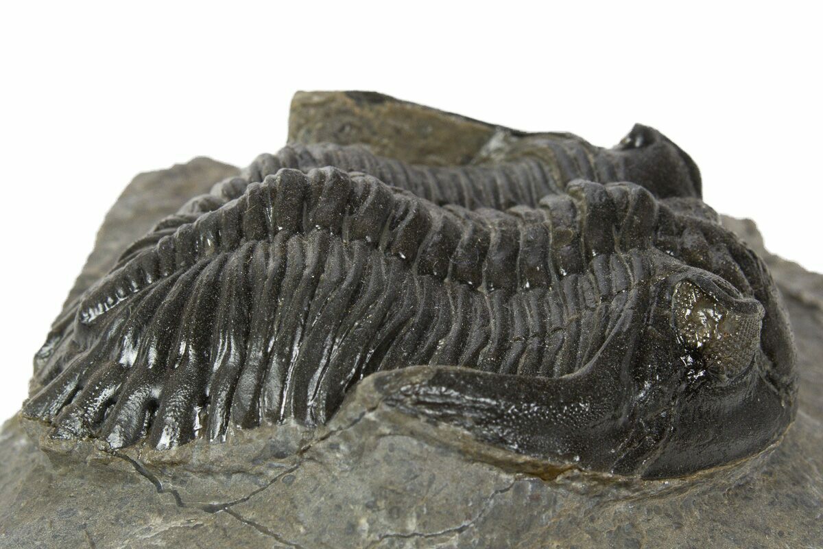 This is a detailed, 2.3" long, Hollardops trilobite from the Ofaten region of Morocco. It features visible eye facet preservation in both compound eyes and only about 1% shell restoration in total along repaired cracks.