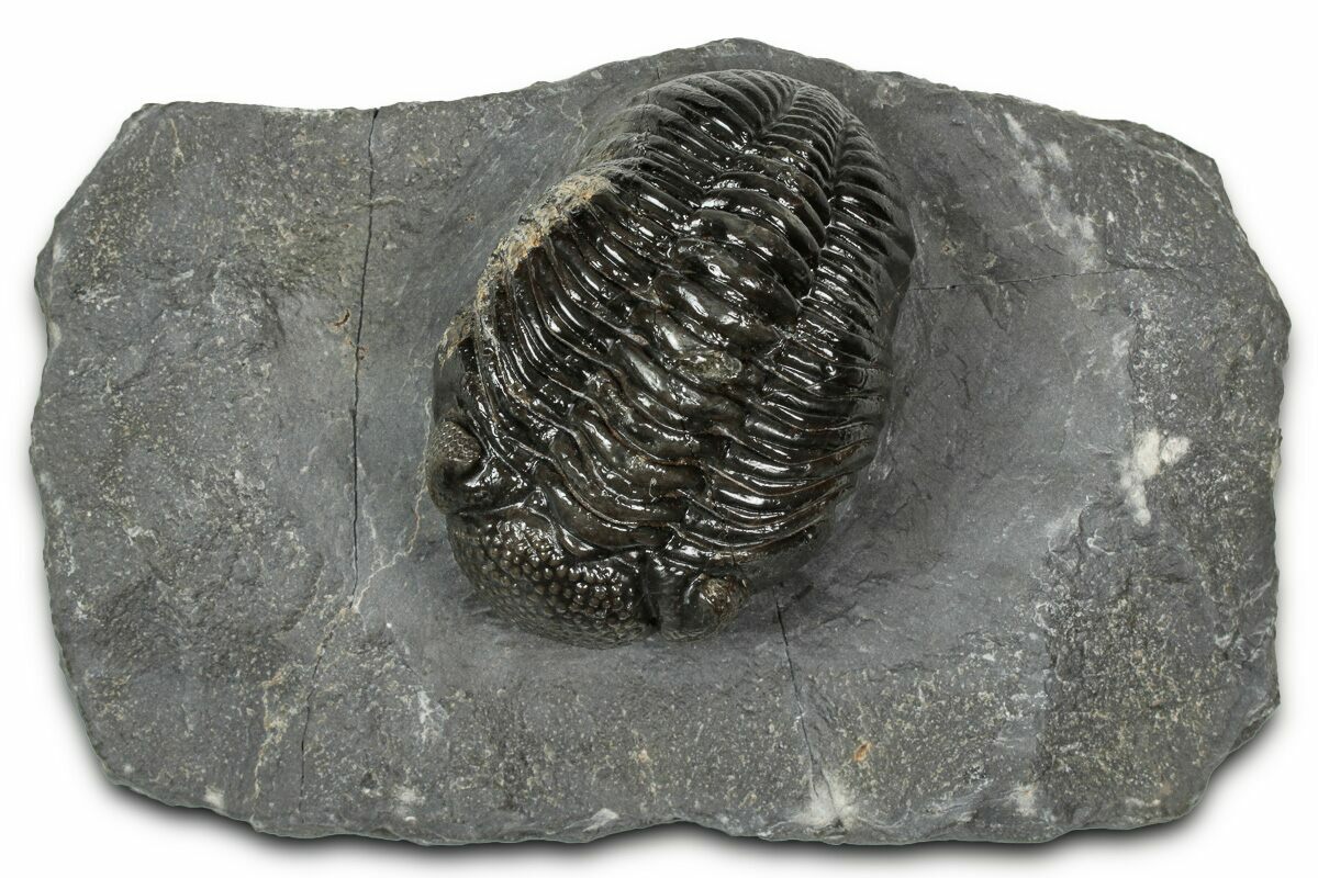 This is a detailed, 2.3" long phacopid (Pedinopariops vagabundus) trilobite from Mrakib, Morocco. It has excellent eye facet detail in both eyes. It has less than 1% shell restoration in total along repaired cracks.