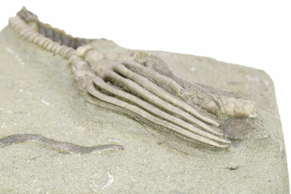 This is an exquisite Macrocrinus mundulus crinoid from the famous crinoid beds near Crawfordsville, Indiana. The quality of preparation on this fossil is exquisite, using skillful air-abrasion techniques under a stereo microscope.