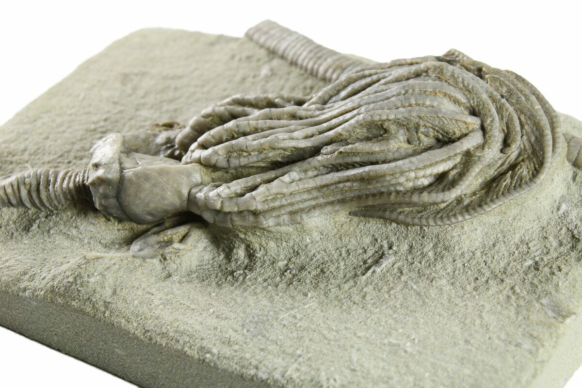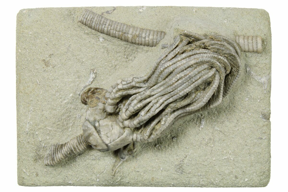 Crinoids from the Ramp Creek Limestone were likely buried in sediment from nearby deltas during storms. The resulting siltstone deposits are soft enough that fossils can be extracted in exquisite, three-dimensional relief.