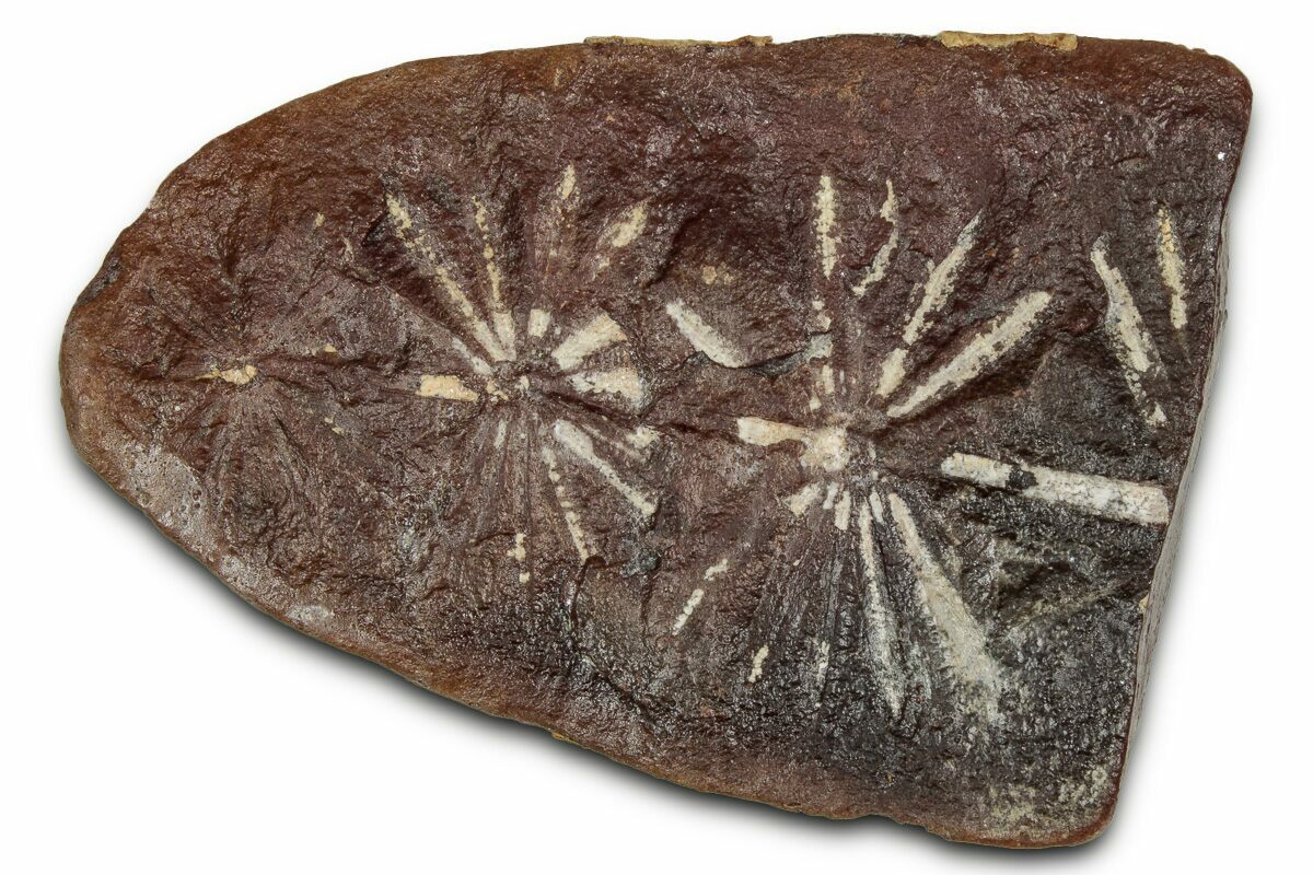 Leaves on Calamites trees formed in clusters of 8 or more, called whorls, at spaced nodes along stems. Annularia indicate flat, starburst-shaped whorls, but the shapes of the leaves themselves could vary from oval (A. sphenophylloides) to lanceolate or needle-like (A. radiata). They can also be identified by midline veins throughout the leaf from node to leaf tip.