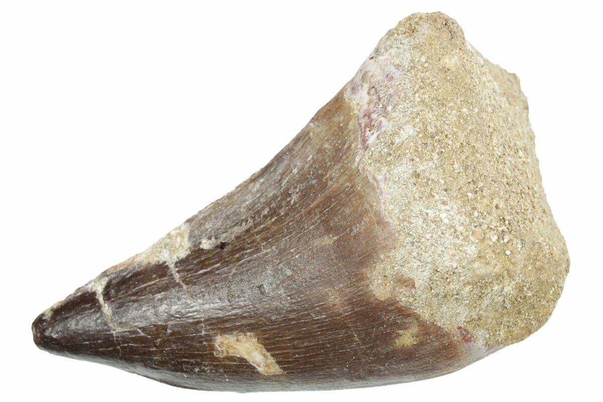 This is a 2.3" fossil mosasaur (Thalassotitan atrox) tooth from the Upper Cretaceous phosphate deposits in the Oulad Abdoun Basin of Morocco.