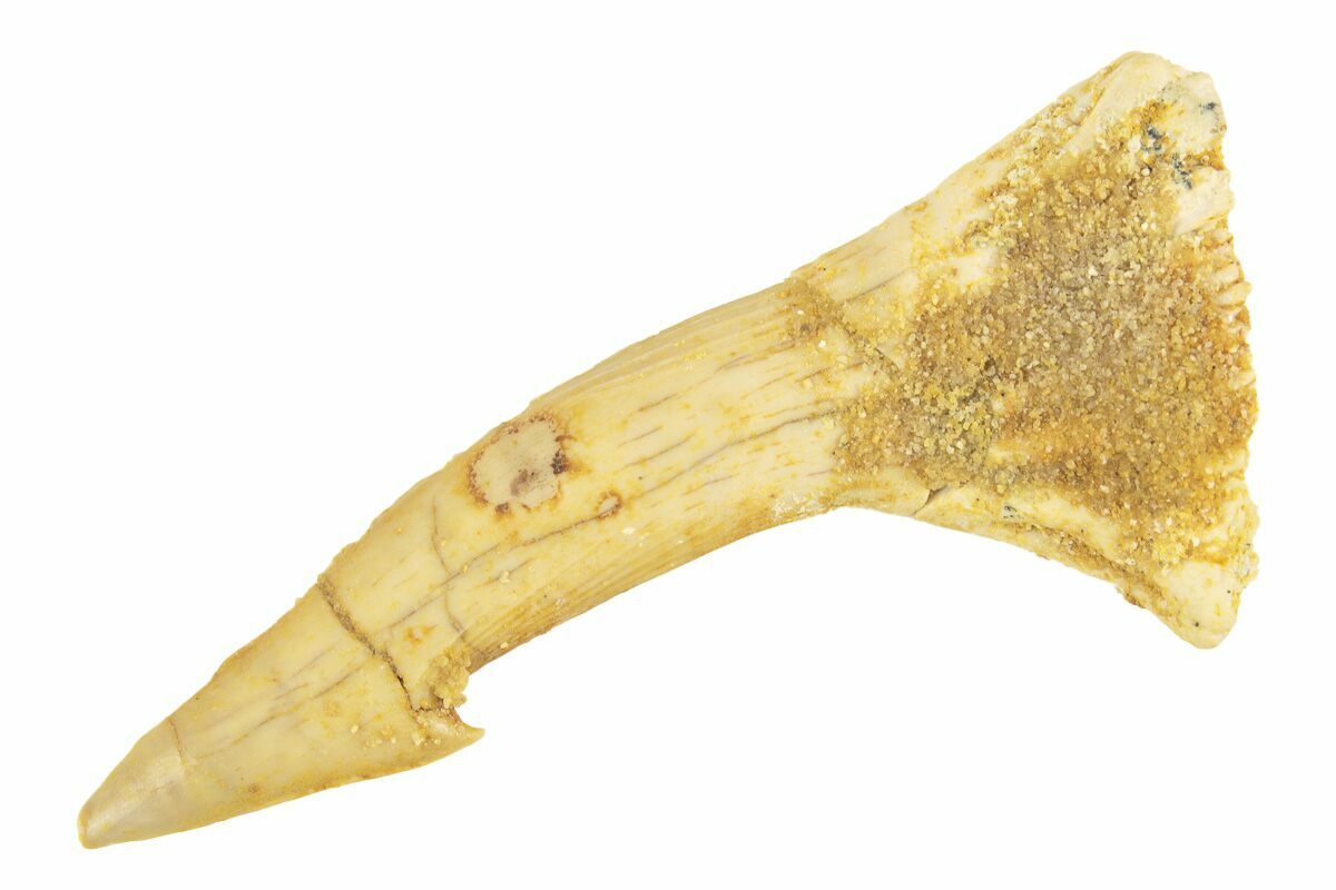 This is a 2.3" long rostral barb/tooth from an extinct, giant sawfish (Onchopristis numidus). It was collected from the Kem Kem Beds in Taouz, Morocco. This specimen has several repaired cracks, and some matrix is still present around the base.