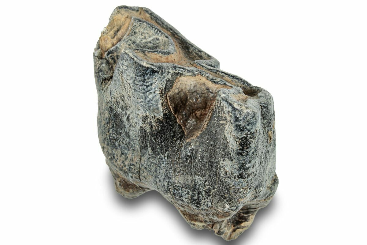 This is a well preserved fossil tooth crown from the lower jaw of a woolly rhinoceros (Coelodonta antiquitatis). The enamel is very well preserved, with black-grey tones coating most of the crown. This fossil comes from Siberia, Russia, where many Woolly Mammoth and Rhino fossils are unearthed. Including the small portion of root present, the tooth measures 2.3" tall.