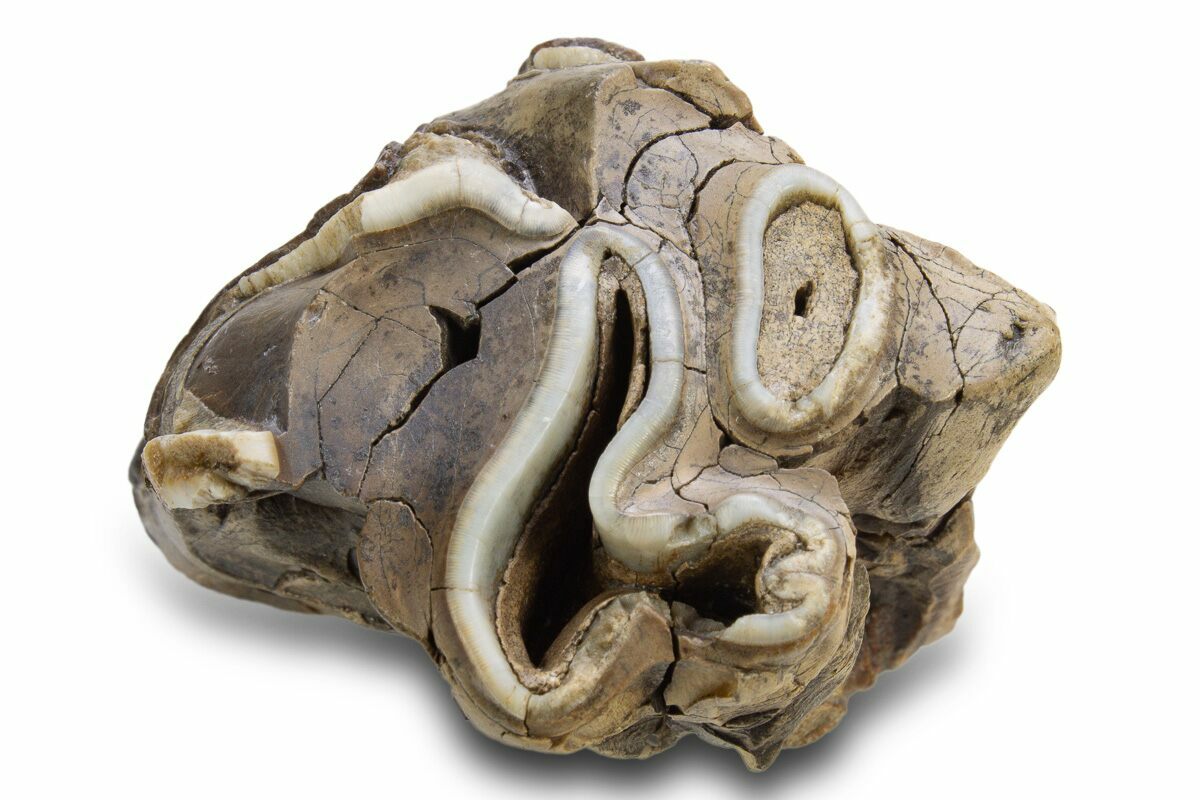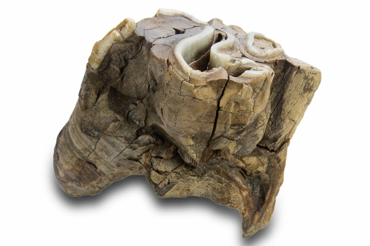 This is a fossil tooth from a woolly rhinoceros (Coelodonta antiquitatis). This fossil comes from Siberia, Russia, where many woolly mammoth and woolly rhino fossils are unearthed. The tooth is mostly complete and has most of its root intact. Including the root, the tooth measures 2.3" tall.