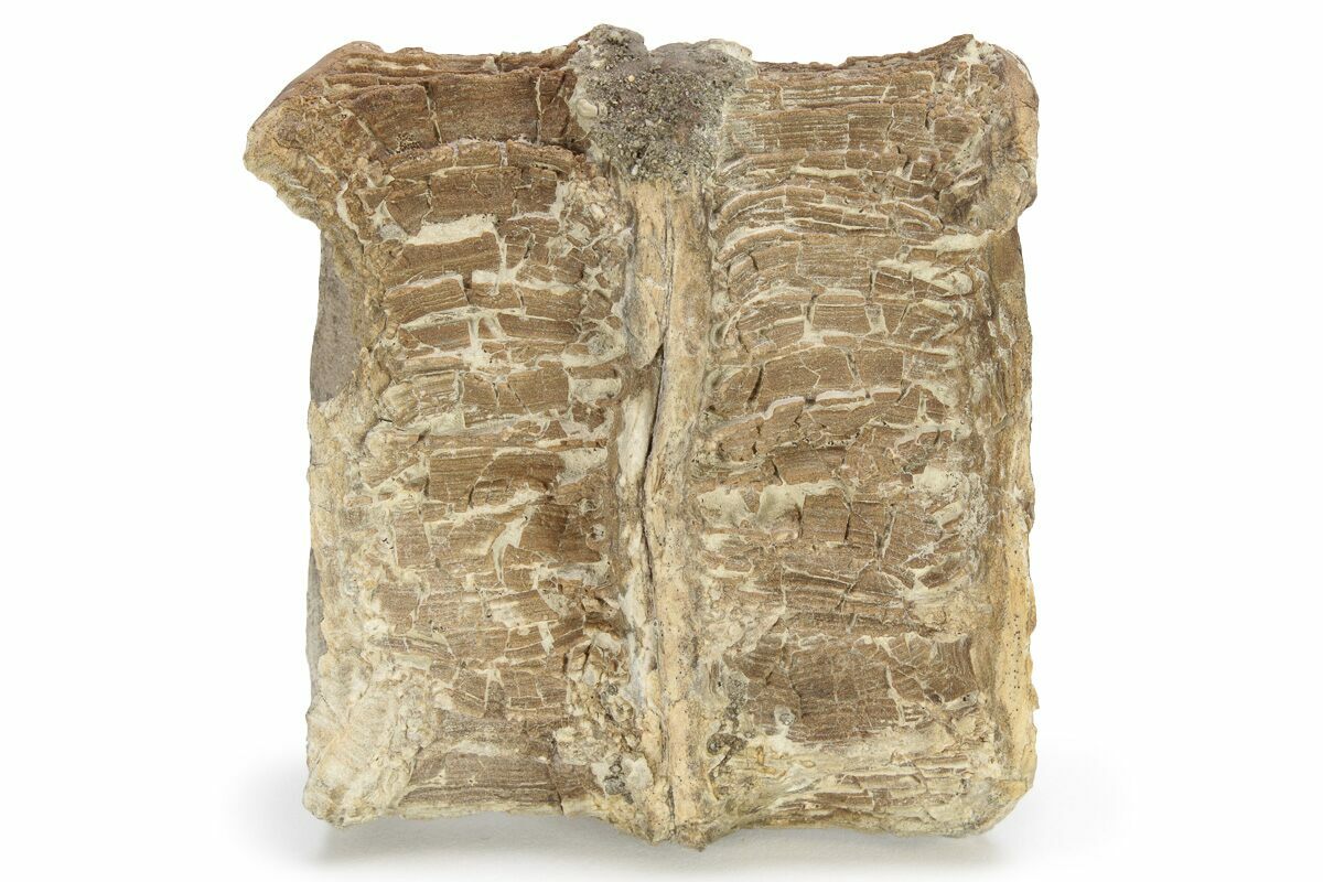 This is a 2.3" long string of two naturally articulated fossil Xiphactinus audax vertebrae from the Niobrara Formation of Gove County, Kansas. These vertebrae were compressed during fossilization, hence their warped preservation.
