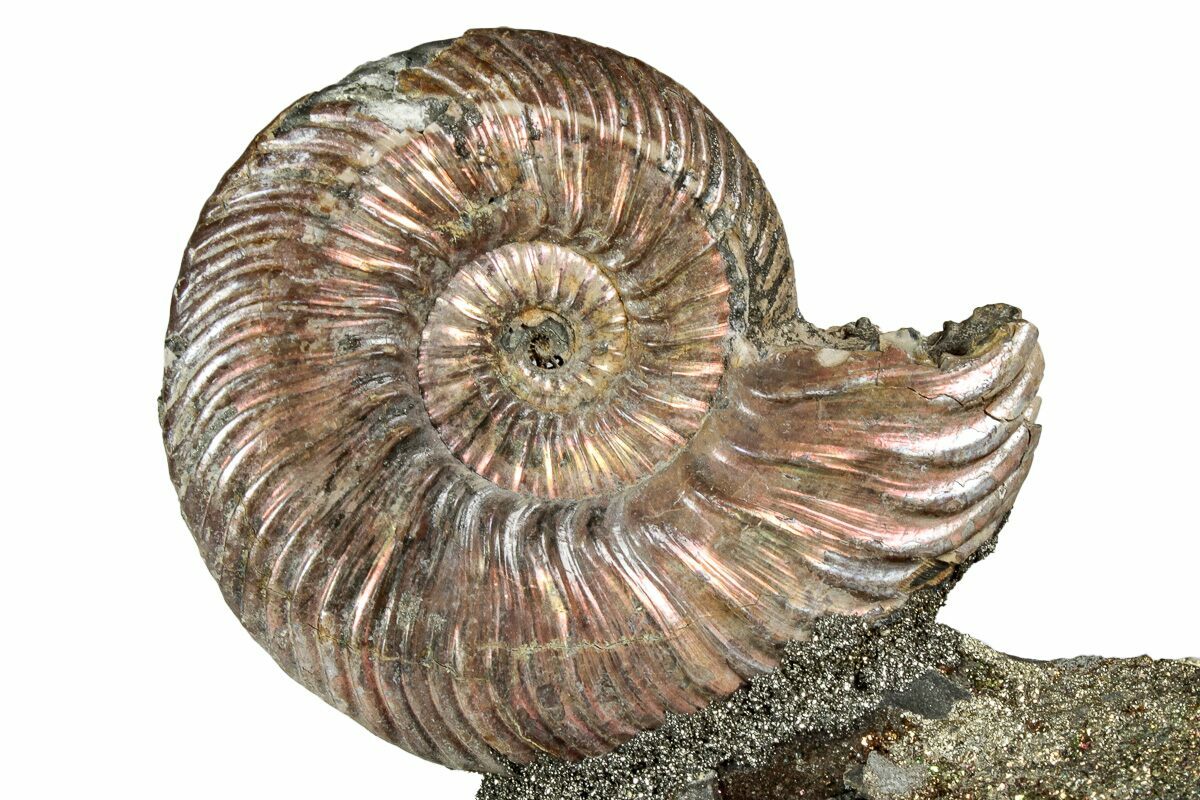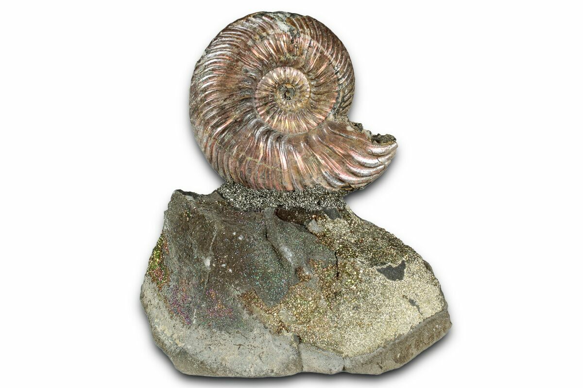 This is an interesting and colorful pyritized ammonite (Quenstedticeras sp.) display. The ammonite was collected from the Middle Jurassic age deposits along the banks of the Volga River near Saratov, Russia. It has been mounted to this section of iridescent pyrite ("rainbow pyrite") encrusted rock to create this alluring display.