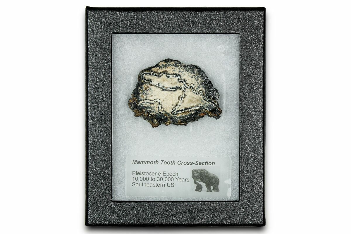 This is a interesting, cross-sectional slice of a Columbia Mammoth (Mammuthus columbi) molar collected from the coastal region of South Carolina. It comes with a riker mount display case.