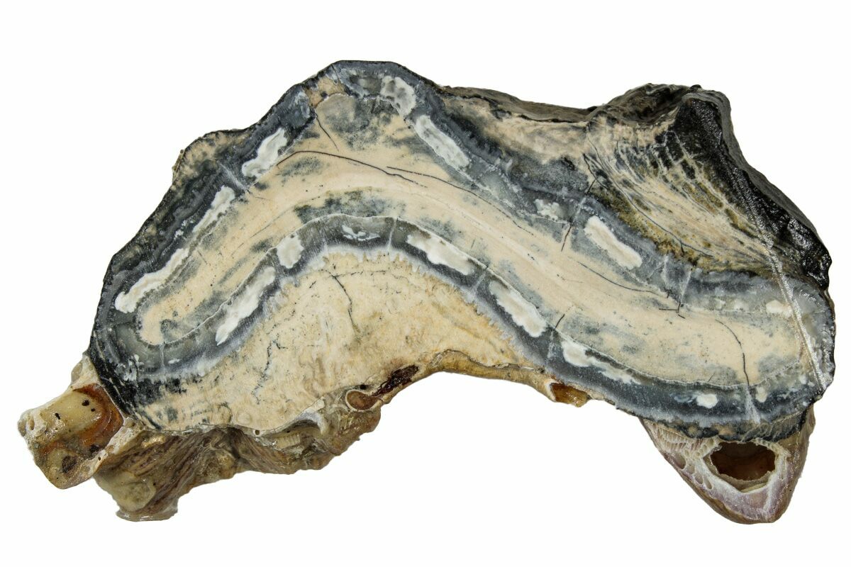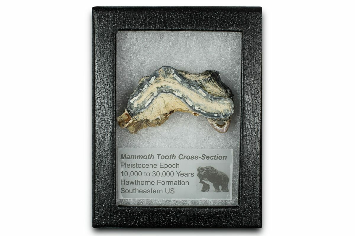 This is a interesting, cross-sectional slice of a Columbia Mammoth (Mammuthus columbi) molar collected from the coastal region of South Carolina. It comes with a riker mount display case.