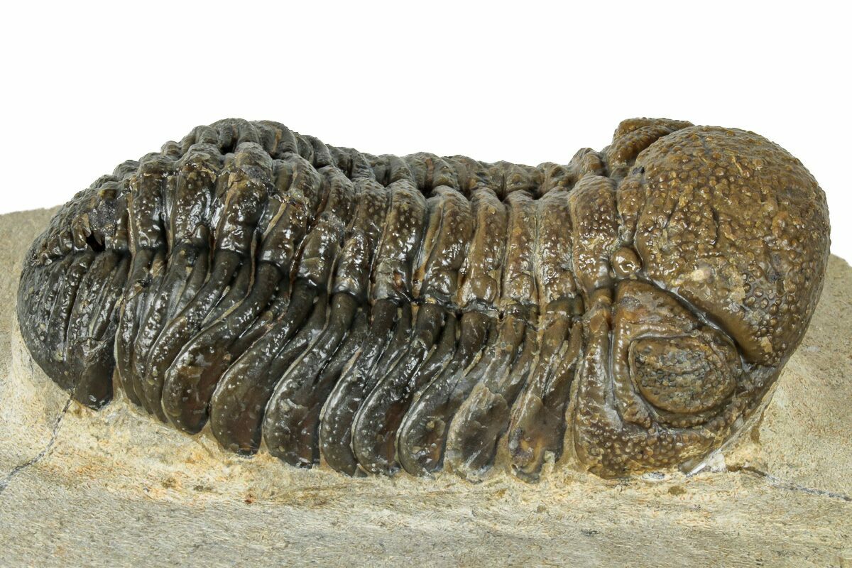 This is a detailed, 2.3" long Morocops trilobite from the Devonian of Morocco. Visible eye facet preservation in both eyes. It has a beautiful, natural, multi-toned shell coloration. There is only about 1% shell restoration in total along a repaired crack.