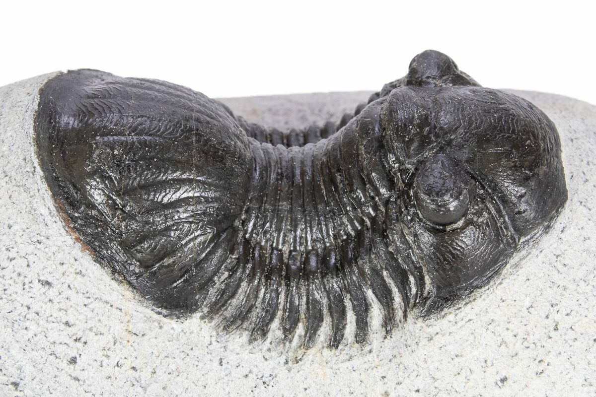 This is a 2.3" long specimen of the Corynexochida trilobite, Paralejurus. It still shows quite a bit of shell detail, and you can even see the hundreds of tiny eye facets under magnification in the right eye. The limestone around it has been removed so that it looks like it is about to crawl off of the rock. It has about 3-4% shell restoration in total along repaired cracks.