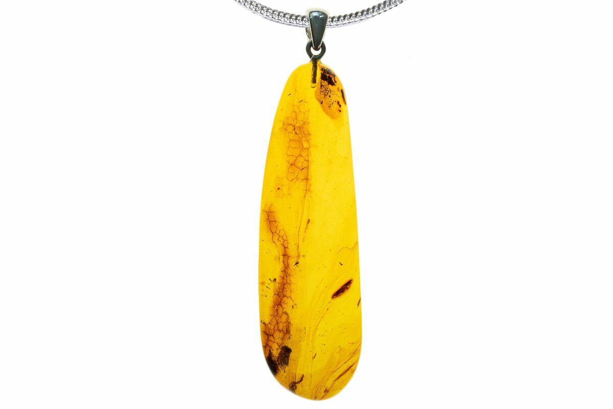 This is a 2.3" tall (including loop) pendant made from 44 million year old Baltic amber. Within the amber, a small fossil fly (order Diptera) can be seen. A loop has been attached to the amber, along with a secondary ring for the included 24" silver plated snake chain to complete the necklace.