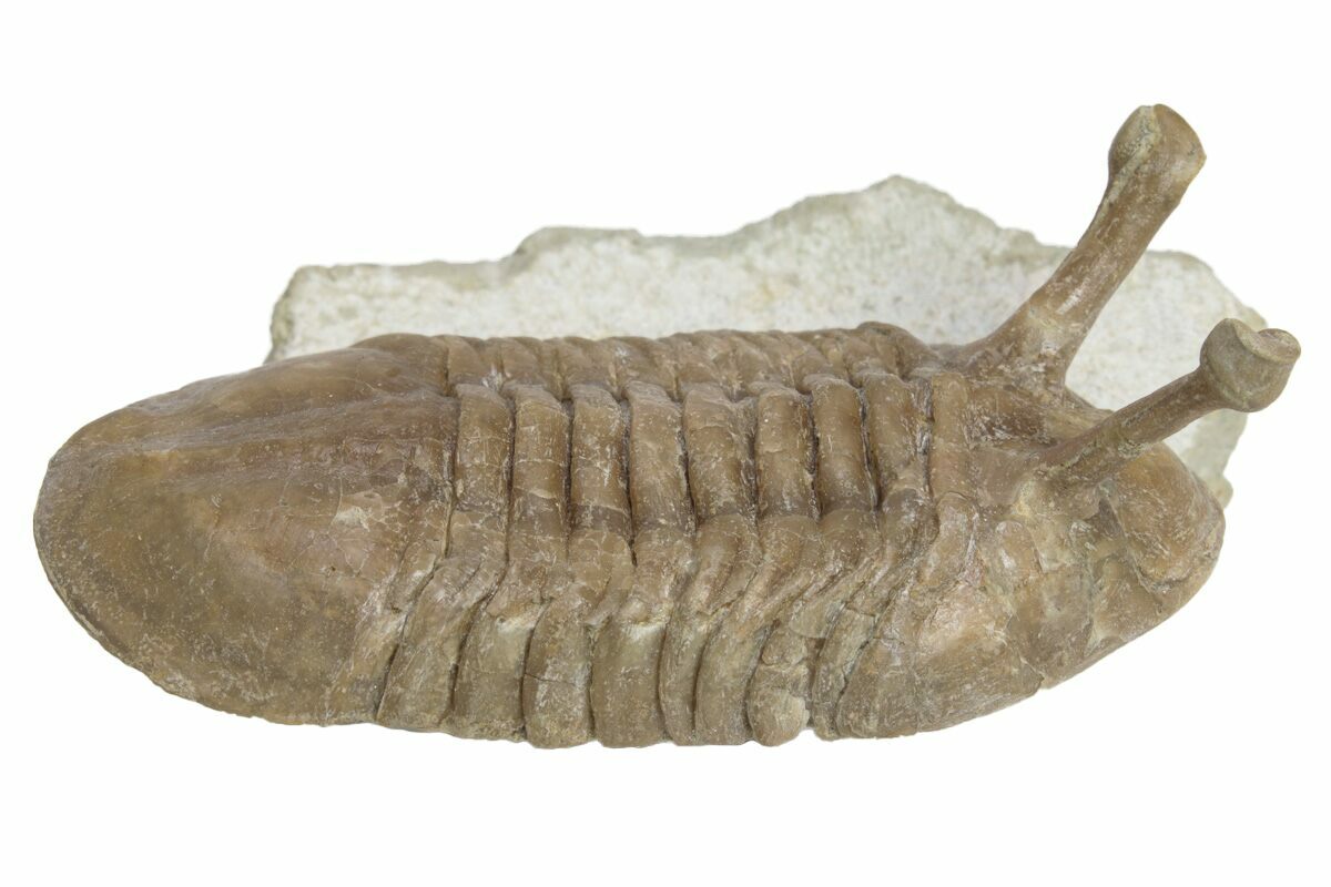 This is a 2.3" long, stalk-eyed trilobite (Asaphus kowalewskii) that looks like it is ready to crawl off of the limestone. It is Middle Ordovician in age and was collected at the Vilpovitsy quarry in the St. Petersburg region of Russia. The stalk eyes likely allowed it to survey its surroundings while remaining buried in the mud.