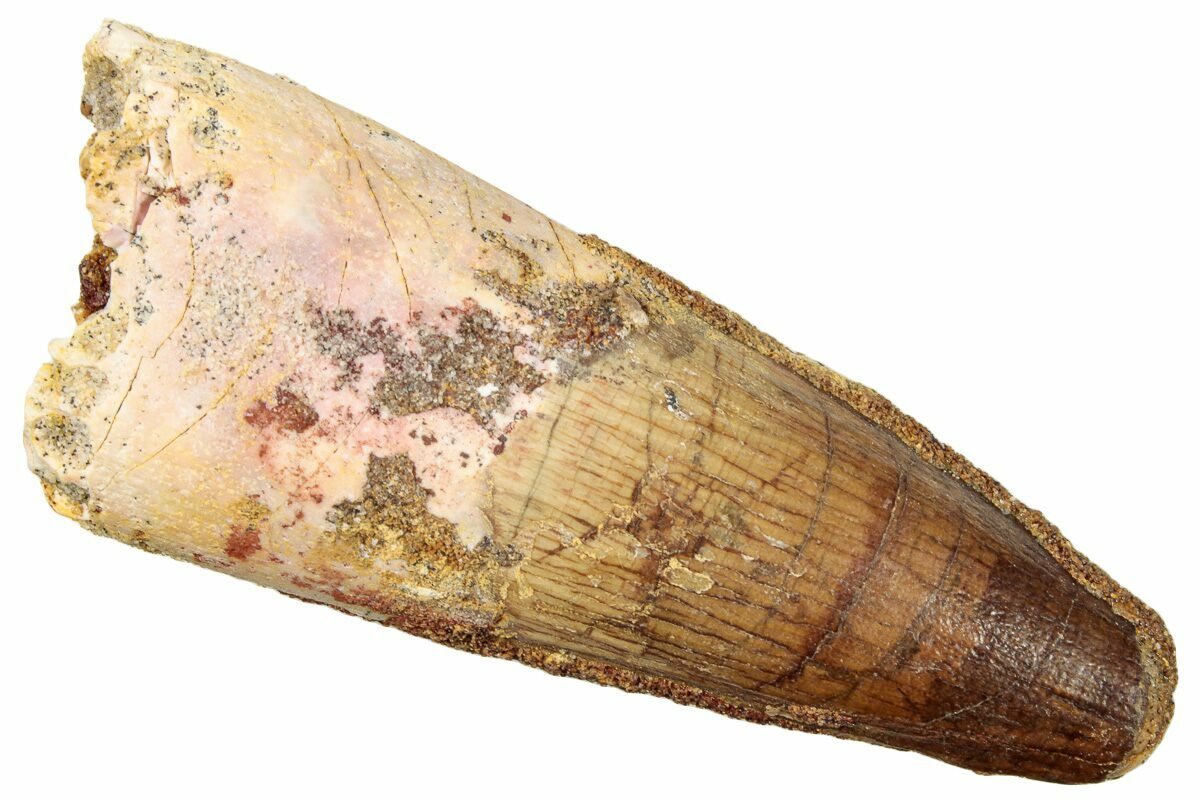 Spinosaurus teeth are relatively common fossils, but large (3+ inches), well-preserved examples are rare. These large Spinosaurus teeth will often be heavily doctored. We’ve seen many examples where multiple partial teeth can been glued to together to create a larger fake tooth, or where enamel has been painted on. One giveaway to look for is a ring of sand around the middle of the tooth, usually glued on to hide a break. Sometimes this is a sign that multiple partial teeth have been composited, but other times it is used to disguise a badly done repair job.