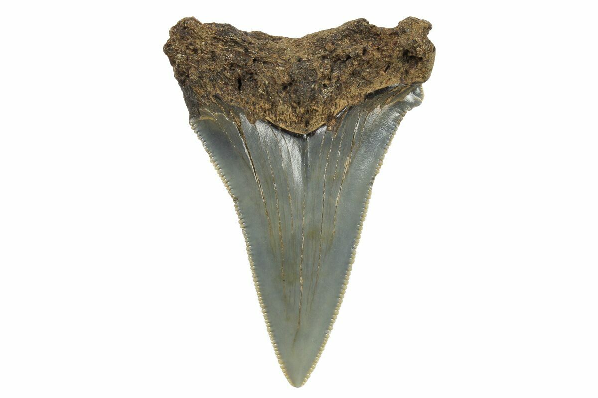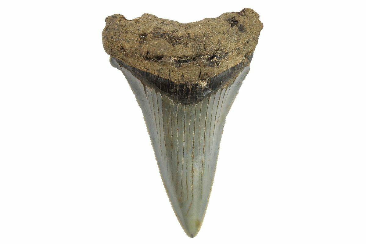 This is a serrated, 2.30" long fossil Otodus angustidens shark tooth. Angustidens is believed to be an ancestor of the fearsome megalodon shark, though it did not grow nearly as large.