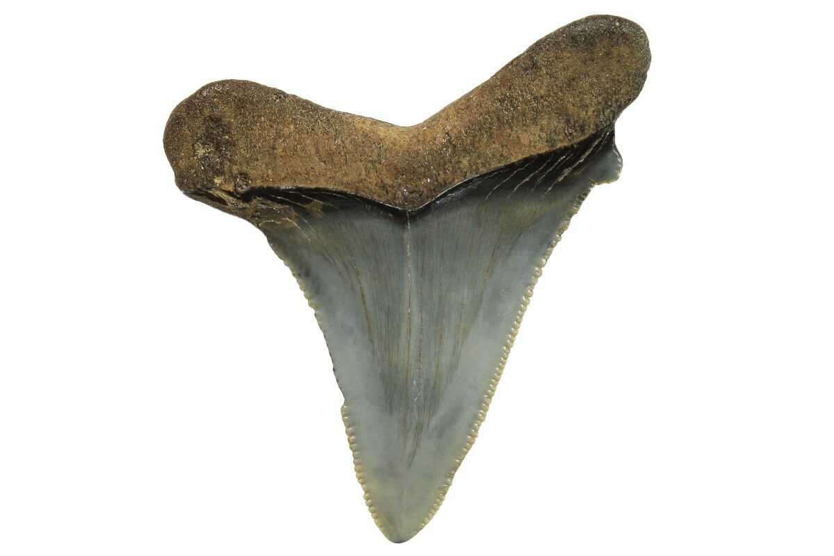 This is a serrated, 2.32" long fossil Otodus angustidens shark tooth. Angustidens is believed to be an ancestor of the fearsome megalodon shark, though it did not grow nearly as large.