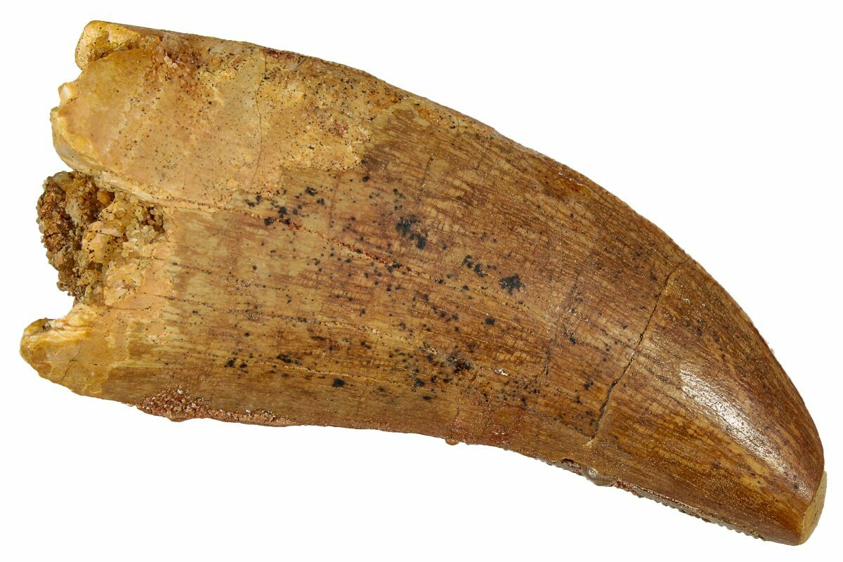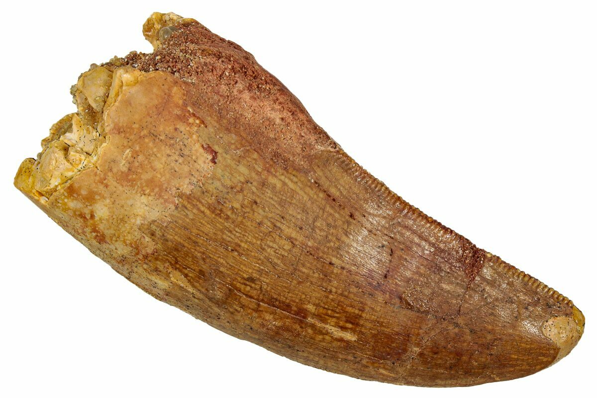 This is a good-sized, serrated, 2.32" long tooth of a Carcharodontosaurus from the Late Cretaceous Kem Kem Beds of Morocco. Carcharodontosaurus was a massive predatory dinosaur larger than Tyrannosaurus rex.