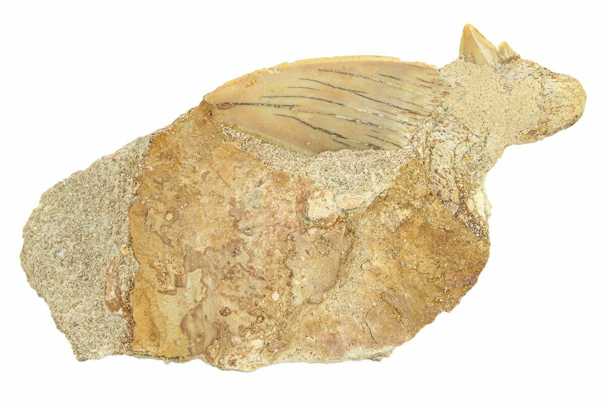 This is a 2.33" fossil tooth of the extinct giant mackerel shark Otodus obliquus, collected from the phosphate deposits in the Oulad Abdoun Basin of Morocco. It is Eocene in age, or approximately 54 million years old. The tooth is only partially exposed from the rock in which it was found.