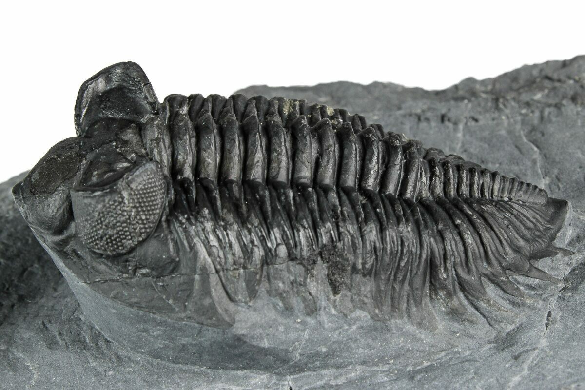 This is a prone, 2.35" long, prone Coltraneia trilobite with amazing "tower eyes" full of hundreds of eye facets. The genus has often been referred to as Treveropyge in the past. It was quarried at Ofaten Mountain, Morocco.