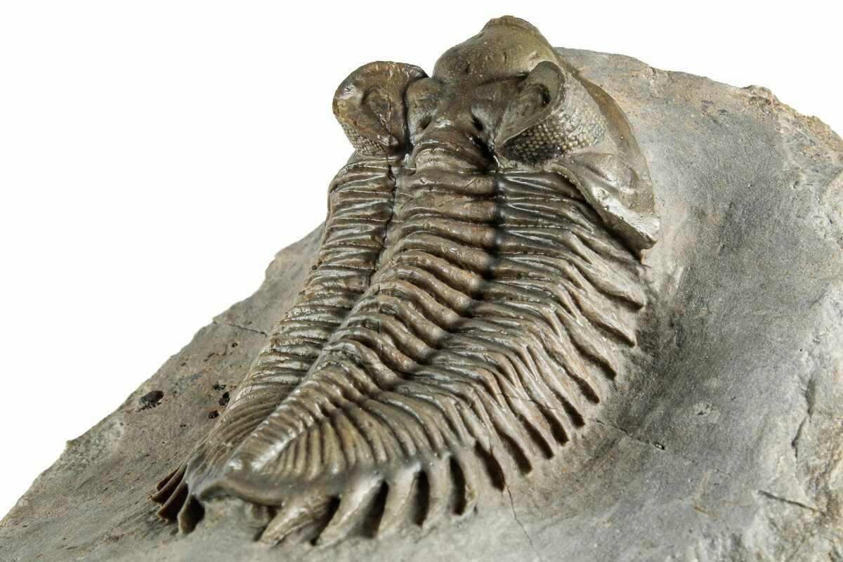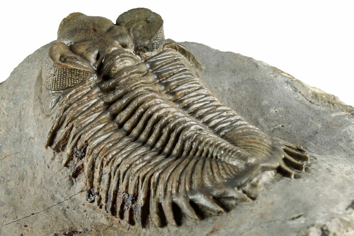 This is an excellent, 2.35" long, bug-eyed Coltraneia trilobite with amazing "tower eyes" full of hundreds of eye facets. The genus has often been referred to as Treveropyge in the past. It was quarried at Ofaten Mountain, Morocco.