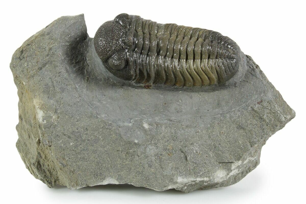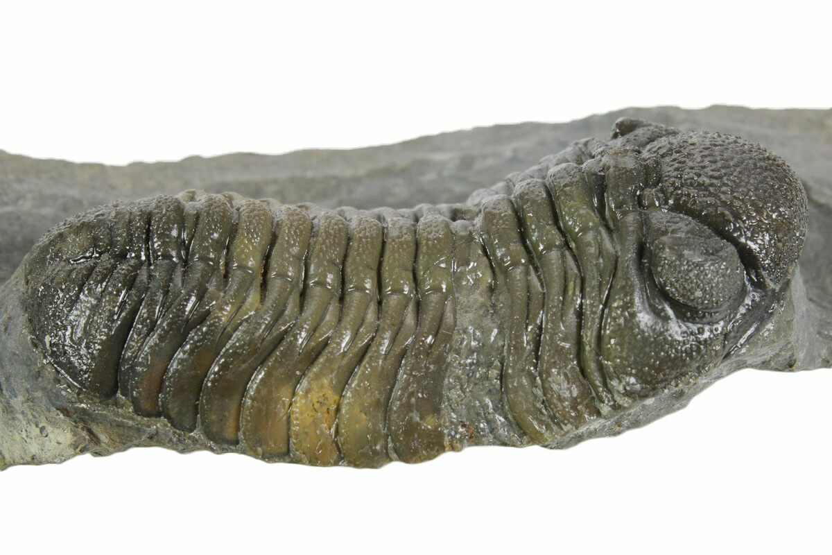 This is a colorful, 2.35" long phacopid trilobite (Morocops) from Ofaten, Morocco. Excellent shell detail, preparation and visible eye facets. It has a natural, multi-toned shell coloration. It has 2-3% shell restoration in total.