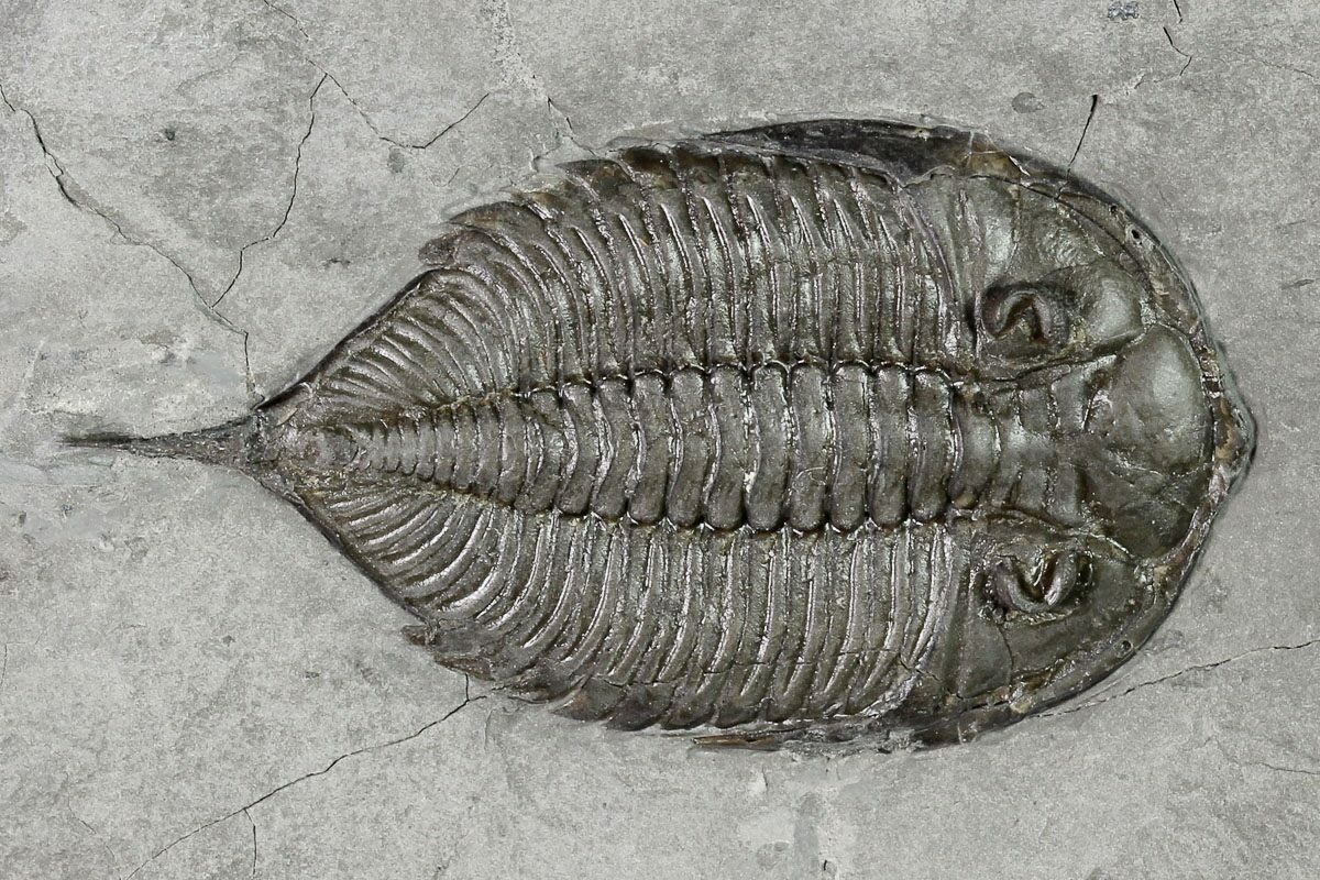 This is a 2.35" long specimen of the classic New York, Silurian trilobite Dalmanites limulurus. It was collected from the famous Caleb's Quarry near Middleport, NY.