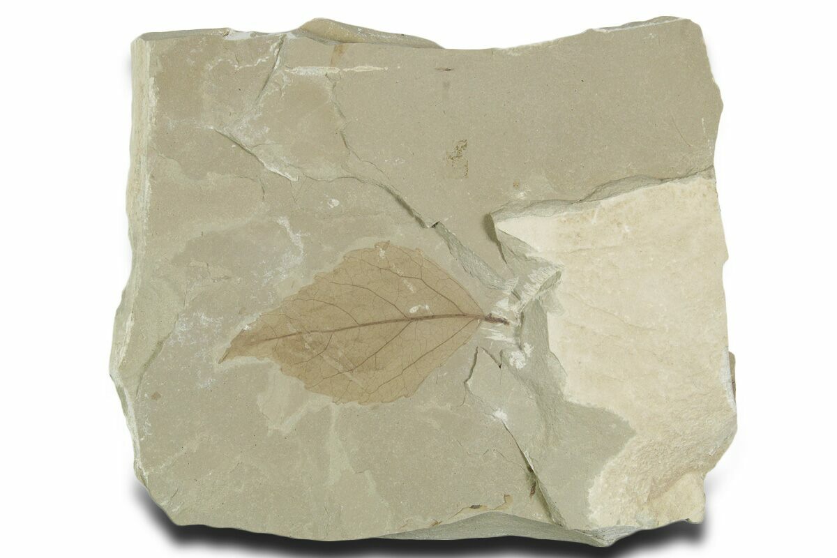 This is a fossil leaf plate from the Green River Formation, Utah. It features a beautiful, 2.35" long (including stem) poplar (Populus wilmattae) leaf with nice detail preservation. The genus Populus includes poplars, cottonwoods, and quaking aspens: this leaf closest resembles cottonwood leaves.