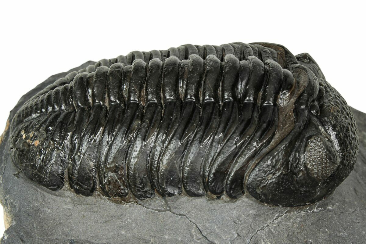 This is a detailed, 2.35" long phacopid (Pedinopariops vagabundus) trilobite from Mrakib, Morocco. It has excellent eye facet detail in both eyes. It has about 1-2% shell restoration in total.